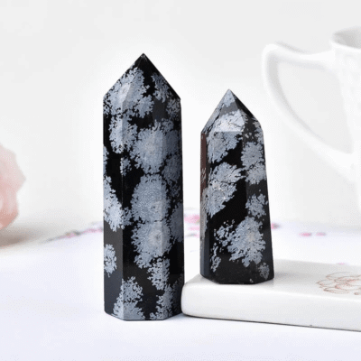 - With the white snowflake patterns and great positive energy, the snowflake obsidian tower is beneficial to encouraging oneself to get out of darkness, embrace the light, and keep oneself calm.