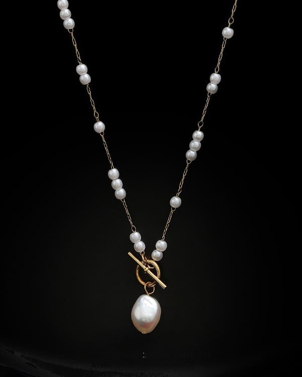 Connected by highly polished rice pearls and baroque pearl, and with a eye-catching OT buckle, this baroque pearl pendant necklace will bring romance and elegance for you!