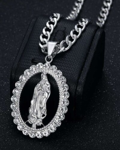 This Mother Mary pendant necklace features a high-quality stainless steel openwork pendant adorned with sparkling cubic zirconia. The necklace has a distinctly hip-hop vibe and is perfect for trendy outfits. It’s available in two sizes, making it suitable for both men and women.
