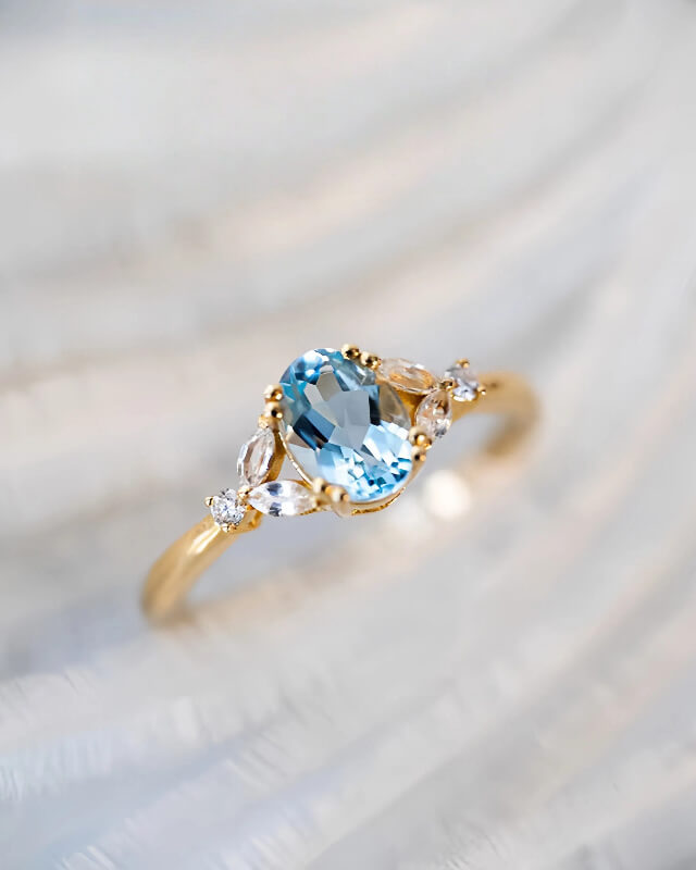 This ring centers on an oval-cut aquamarine, its fresh, transparent hue capturing the quiet, sparkling clarity of a sunlit calm ocean — a piece that feels like holding a little piece of the sea.