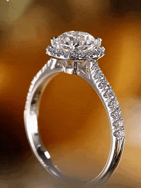 Featuring a classic bezel setting, the center stone is surrounded by numerous small round diamonds, symbolizing unending love.