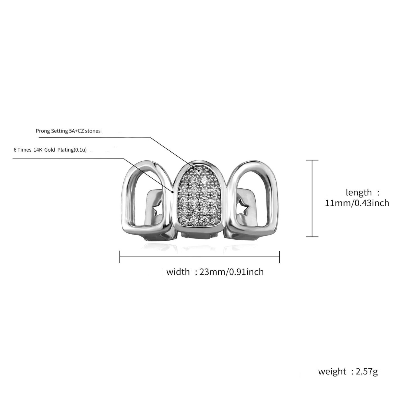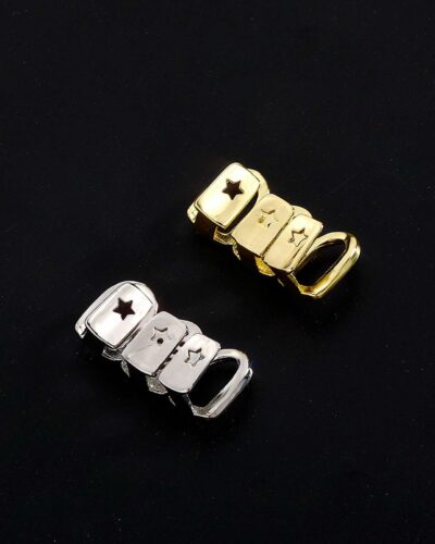 ¡Grillz calados de tres dientes chapados en oro! Dos diseños huecos combinados con uno totalmente engastado con circonitas crean un llamativo impacto visual. Tanto si los llevas a diario como en una reunión festiva, seguro que atraerán todas las miradas.
