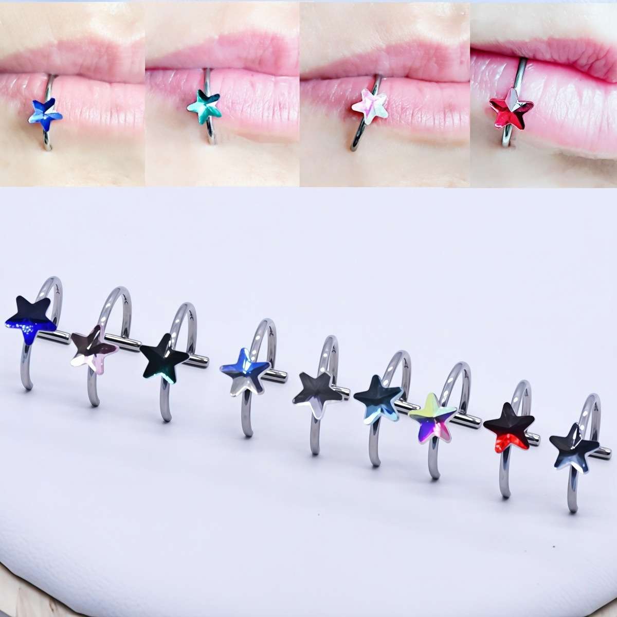 Star-Shaped Stainless Steel Lip Ring Wholesale. This exquisite five-pointed star-shaped lip ring features mirror-polished corners for a soft, scratch-free fit. Easily complement any makeup look, letting you shine confidently on every occasion!