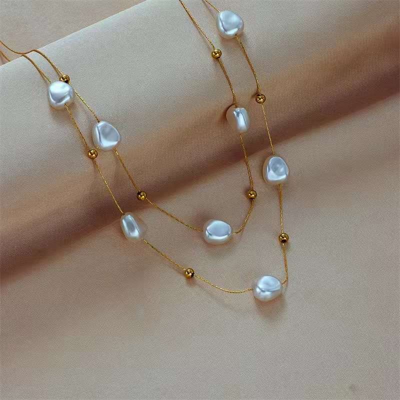 Retro Barroco Perla Irregular Doble Capa Cadena de Acero Inoxidable Mujeres