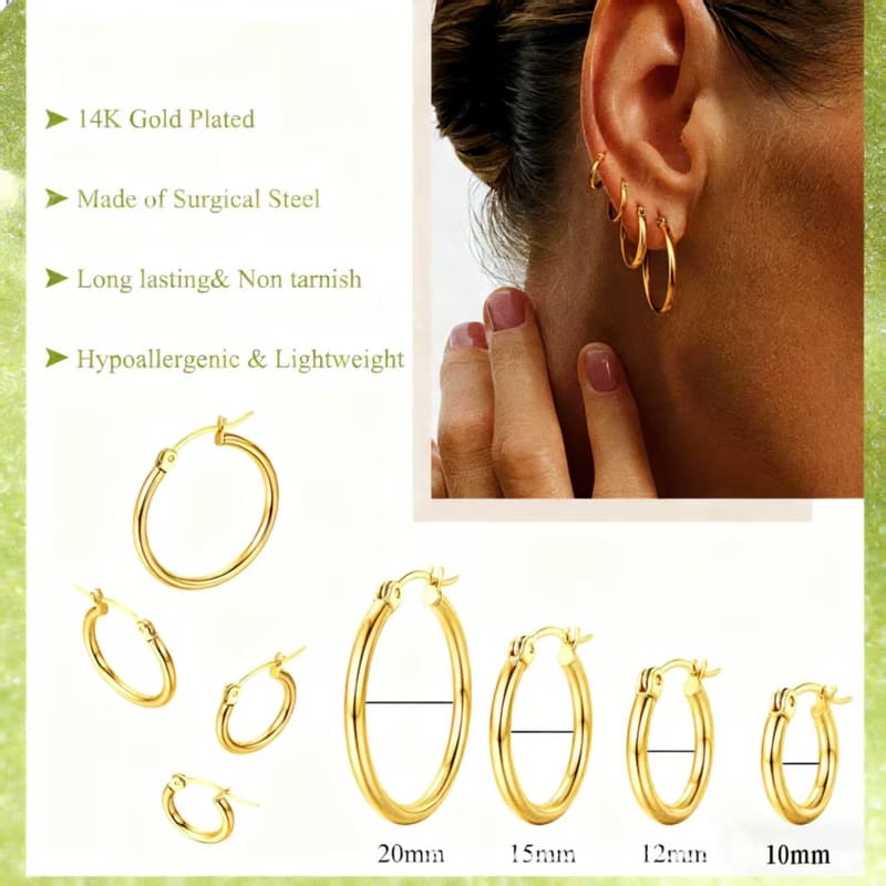- Made of surgical steel, the stainless steel gold hoops are hypoallergenic and lightweight.