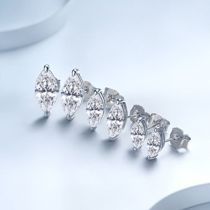 Marquise Cut Moissanite Earring Rhodium Plated Wholesale. The marquise-cut technique is used to visually magnify the main stone, showing luxury. Professionals wear it with formal attire to exude aura.