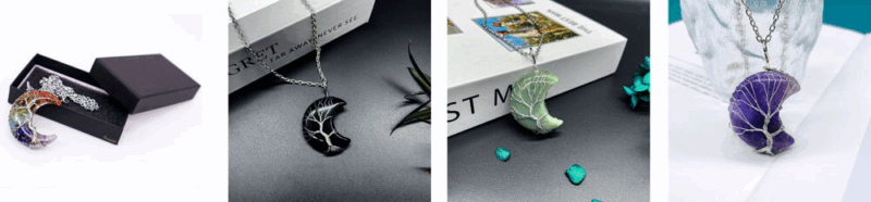 - This moon crystal necklace is made with natural crystals and natural gemstones. It is designed with enveloped life tree and polished into a perfect shape.