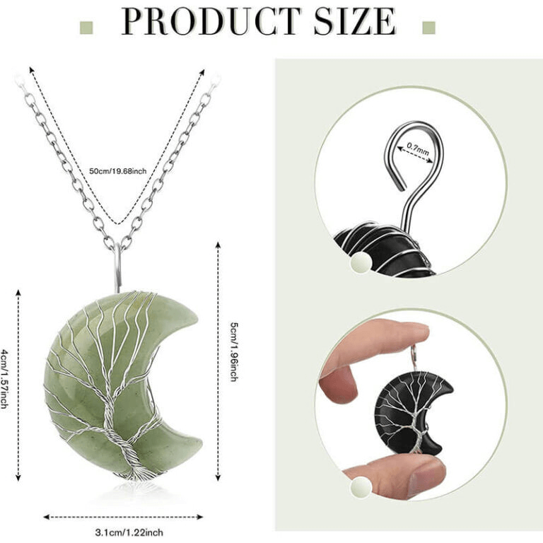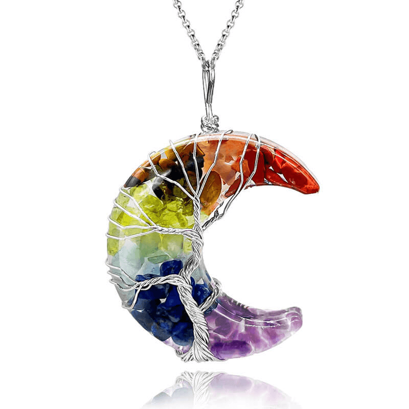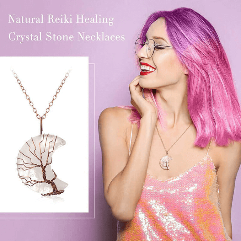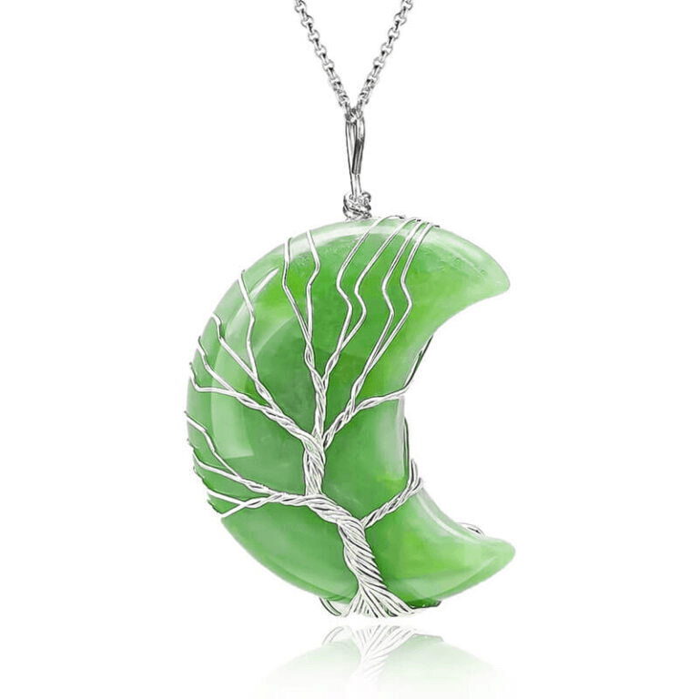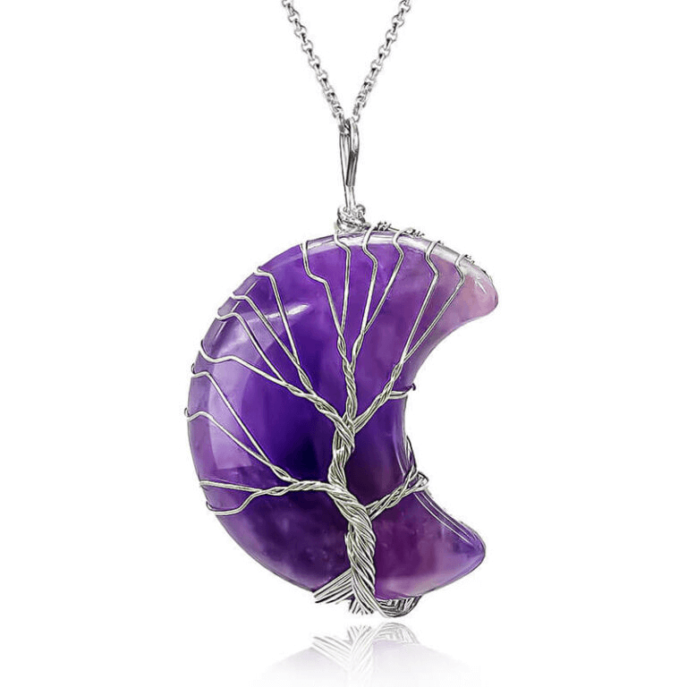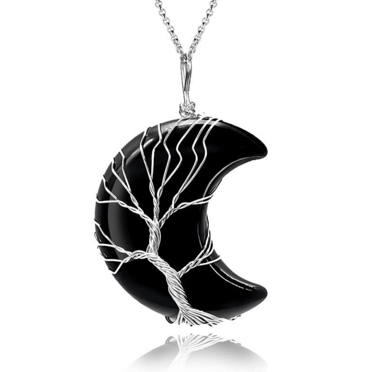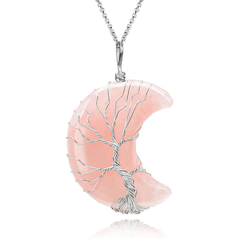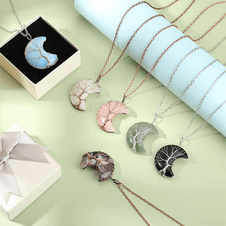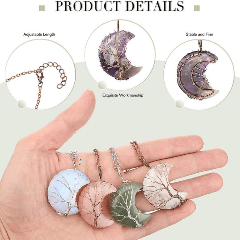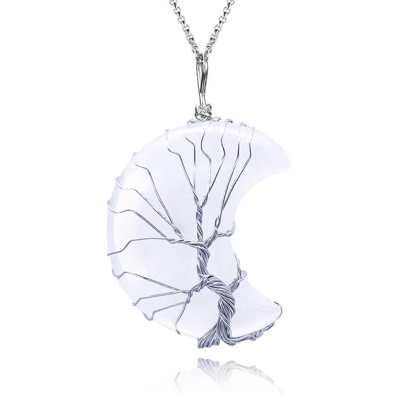 - This moon crystal necklace is made with natural crystals and natural gemstones. It is designed with enveloped life tree and polished into a perfect shape.
