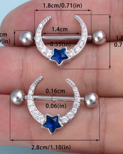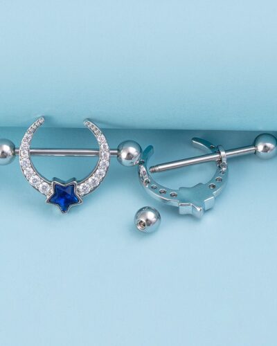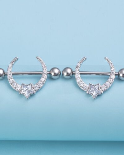 Nippe Piercings Jewelry with Star-Shaped Design✨. Made of stainless steel, the moon-shaped nipple studs are inlaid with star-shaped zircon stones. They enhance your charm after wearing, and are designed for private wear, smooth and non-irritating.