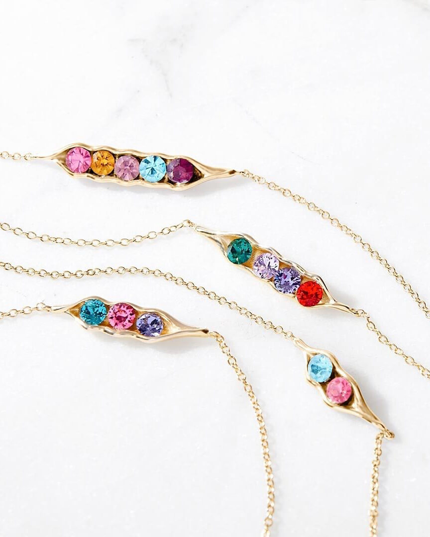 Crafted with a open pea pod charm, it features 1-5 round-cut cubic zirconia (CZ) stones, each customizable to represent the birthstones of family members, partners, or friends.