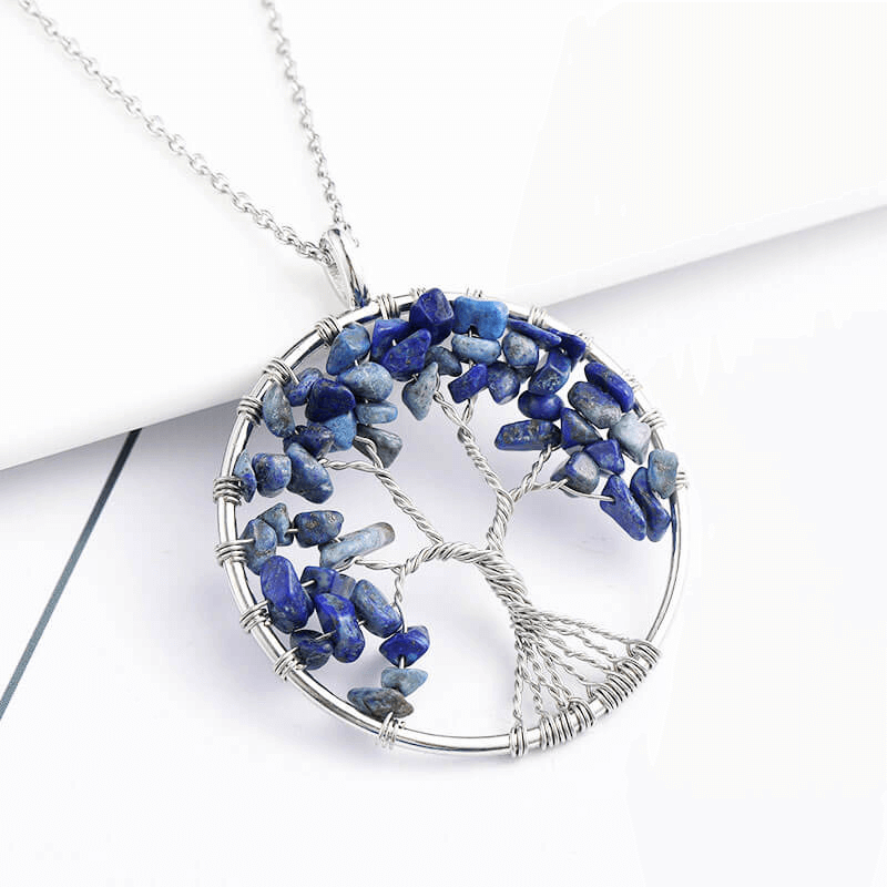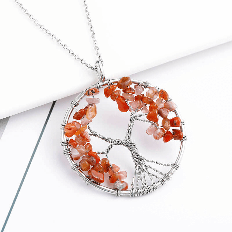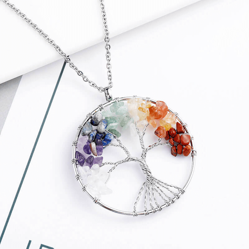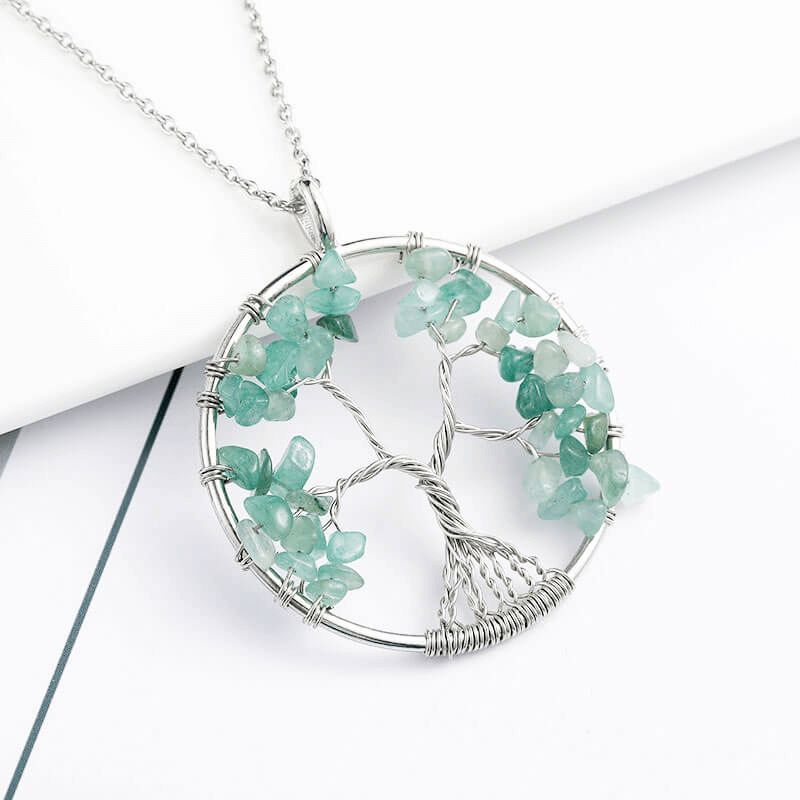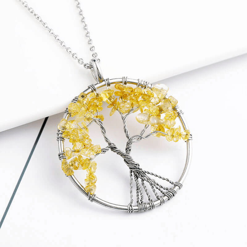 - Within the circular pendant, an organic arrangement of crystal stones intertwines with delicate wires, creating a lifelike tree design that radiates vibrant positive energy.