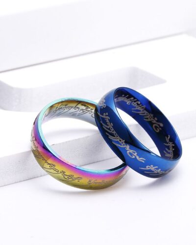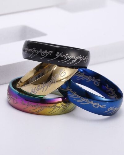 Elvish Script Stainless Steel Ring for Mens. The stainless steel ring features ancient Elvish script, surrounding it with a sense of mystery! The unique design is suitable for movie or game enthusiasts.