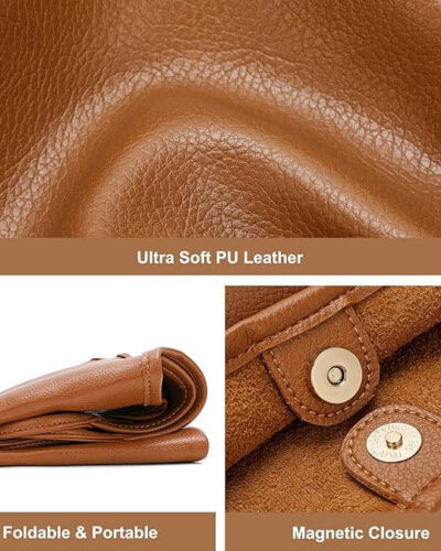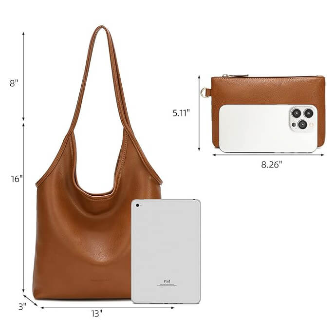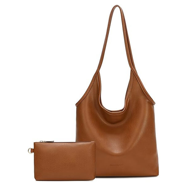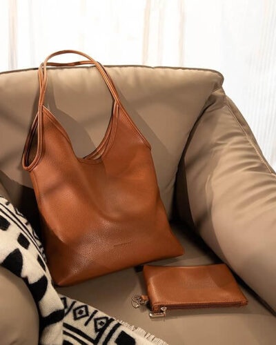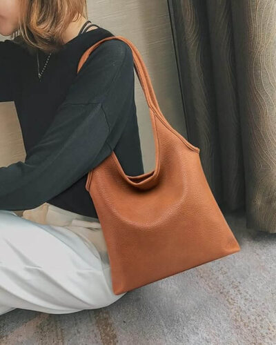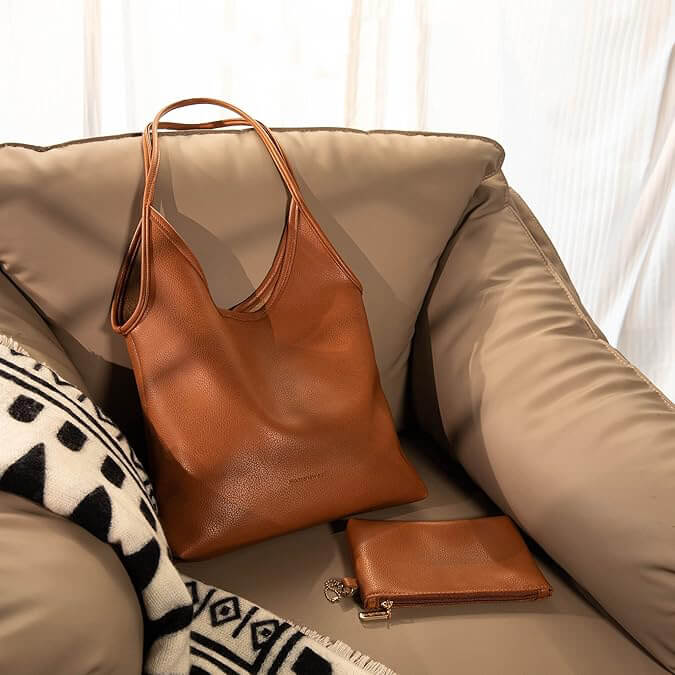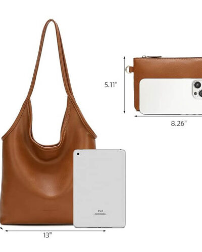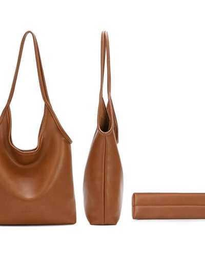 Crafted from smooth PU leather in a warm tan hue, the roomy hobo tote bag features a slouchy, relaxed silhouette and long shoulder straps for comfortable all-day carry—spacious enough to hold laptops, daily essentials, and more.