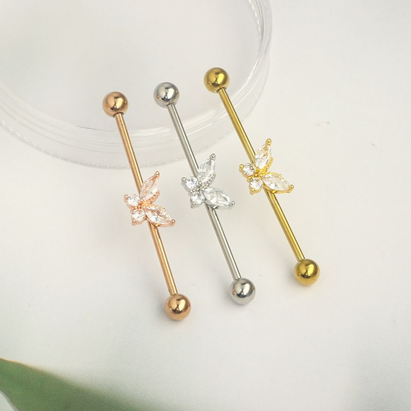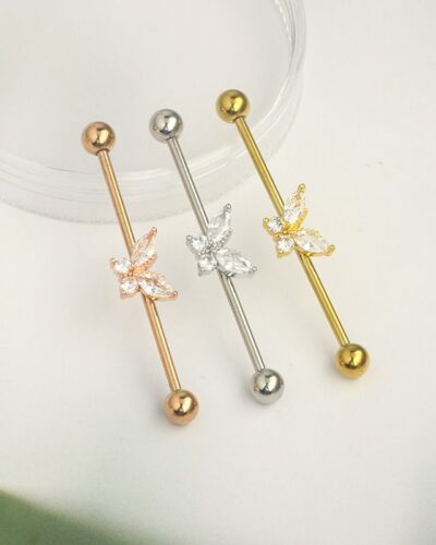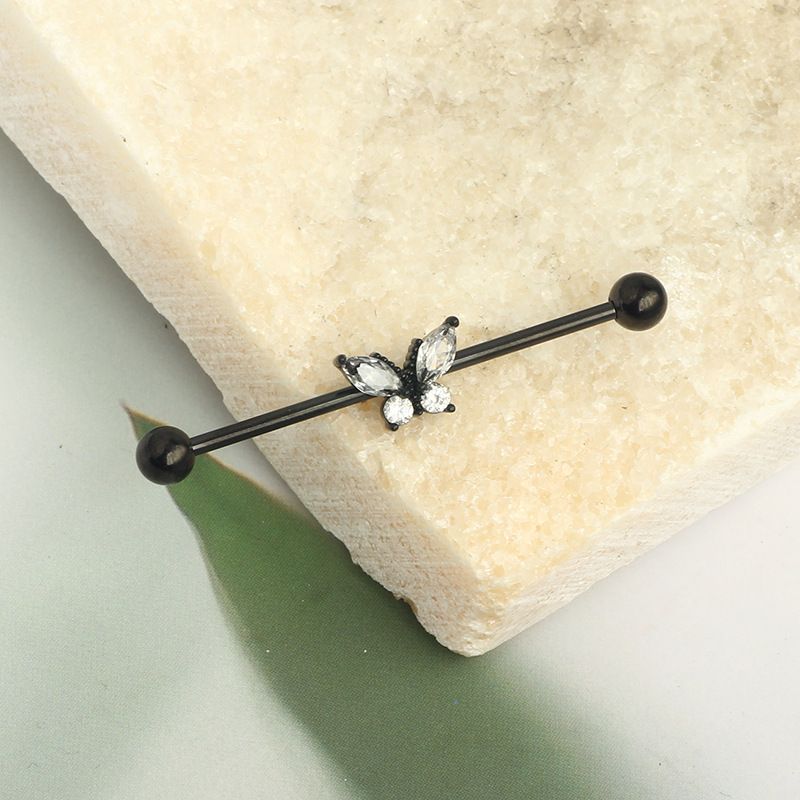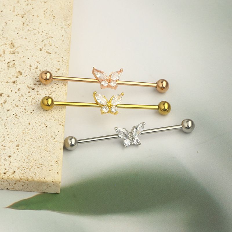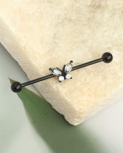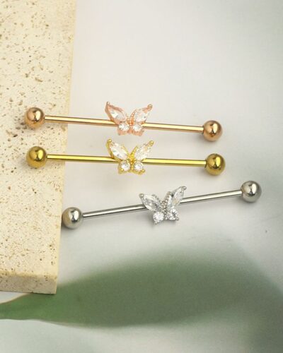 Straight Barbell Piercing with Butterfly Design. A stainless steel straight bar piercing designed for the ear bone! The bar is light and comfortable to wear for a long time. It is inlaid with butterfly-shaped zircon to create a light and agile feeling!