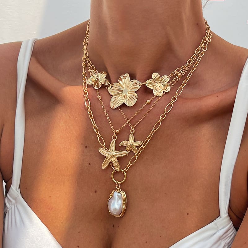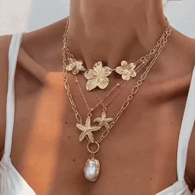With the exquisite engraved flowers and pearl, this pearl starfish necklace is suitable for bohemian style.