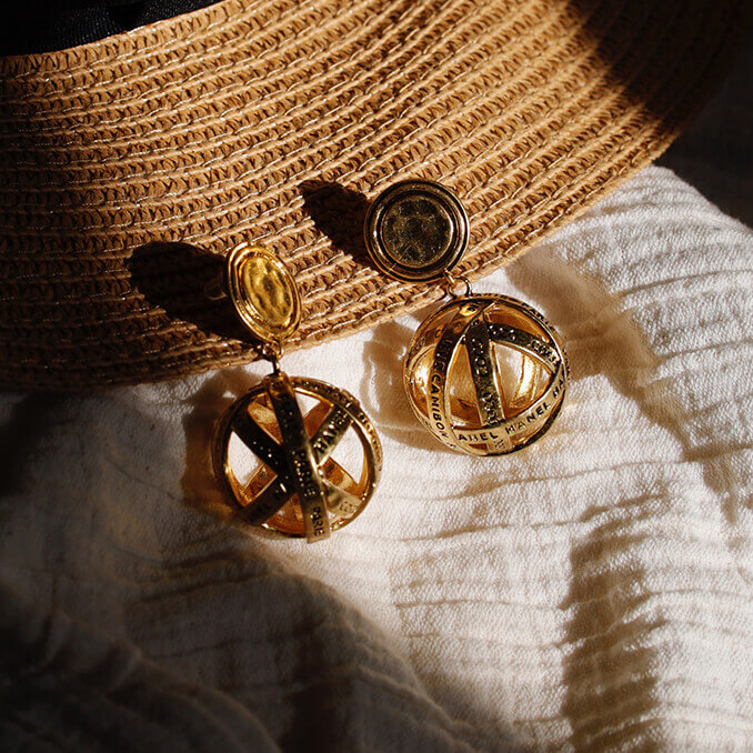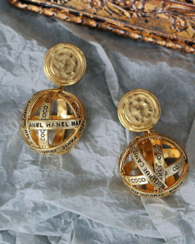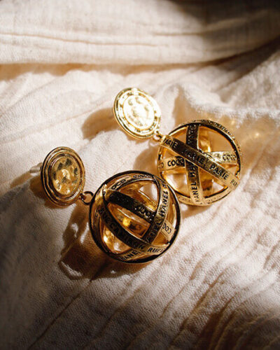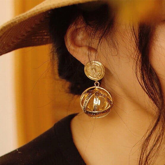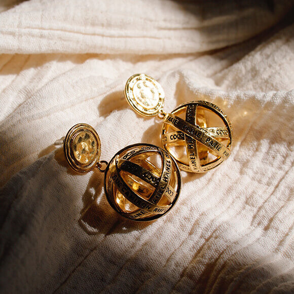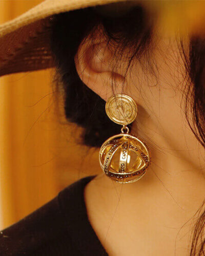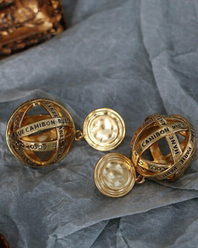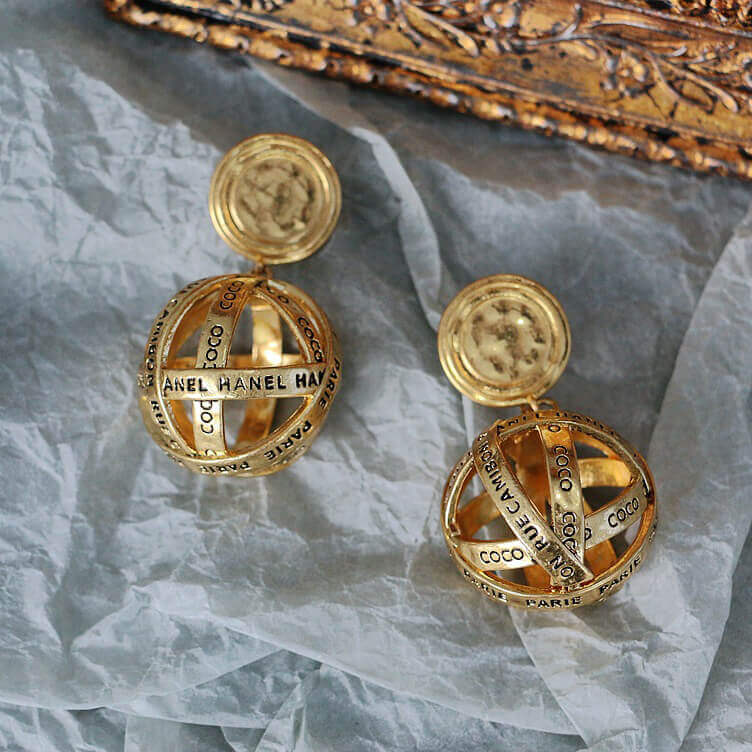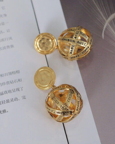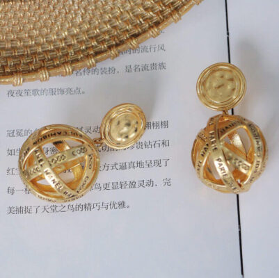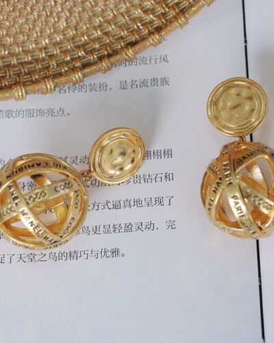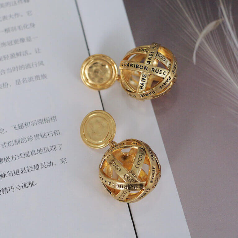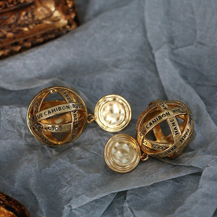 These gold ball drop earrings are made of a creative hollowed sphere design with letters.