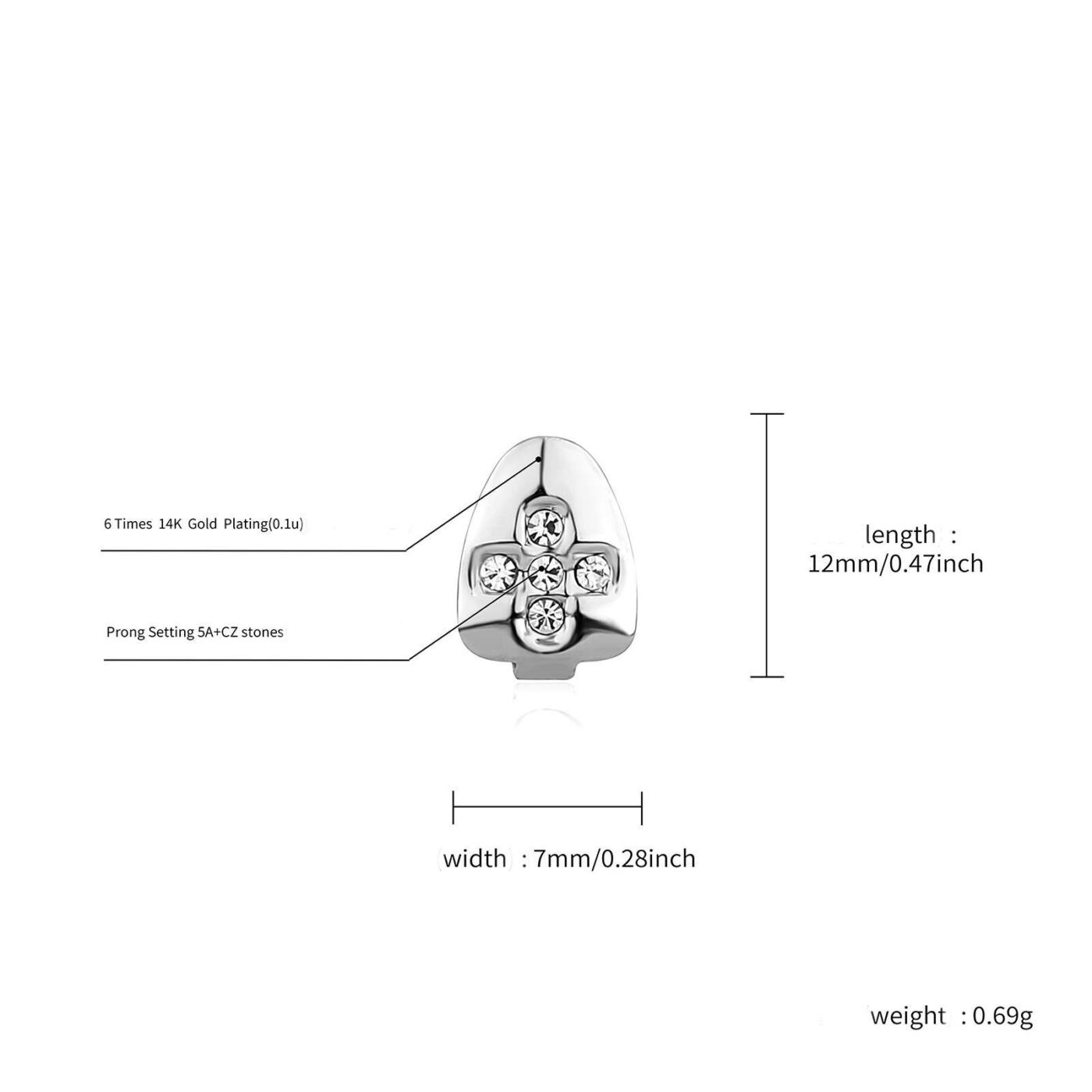 HIPHOP One Tooth Grillz avec design en forme de croix ! Ce grillz à une dent comporte 5 zircons de haute qualité pour créer une forme de croix classique, et sa surface est plaquée de 6 couches d'or 14K.