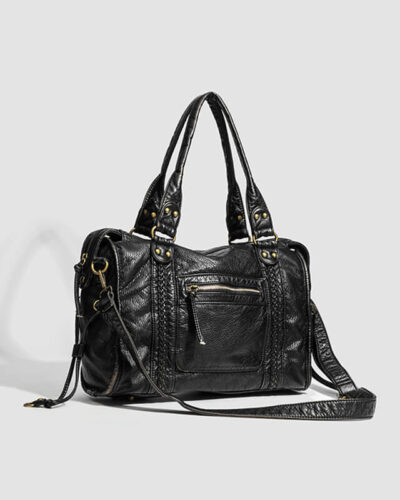 Crafted from buttery-soft, textured leather in a classic black hue, the leather shoulder bag exudes a vintage-inspired hobo aesthetic with its slouchy silhouette, braided detailing, and antique gold-tone hardware.
