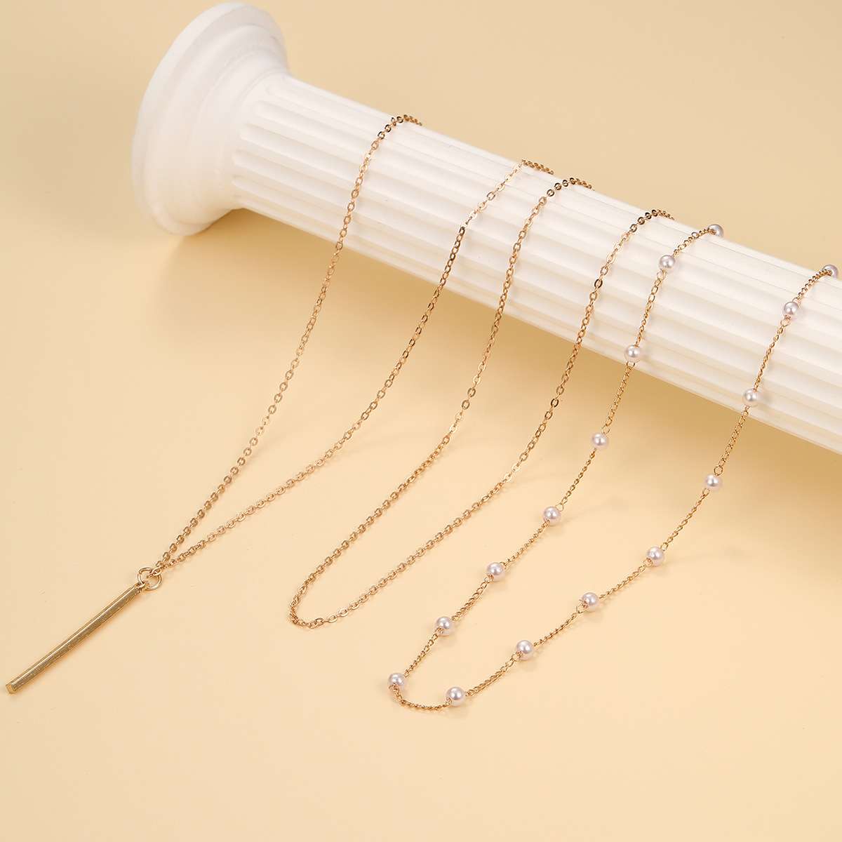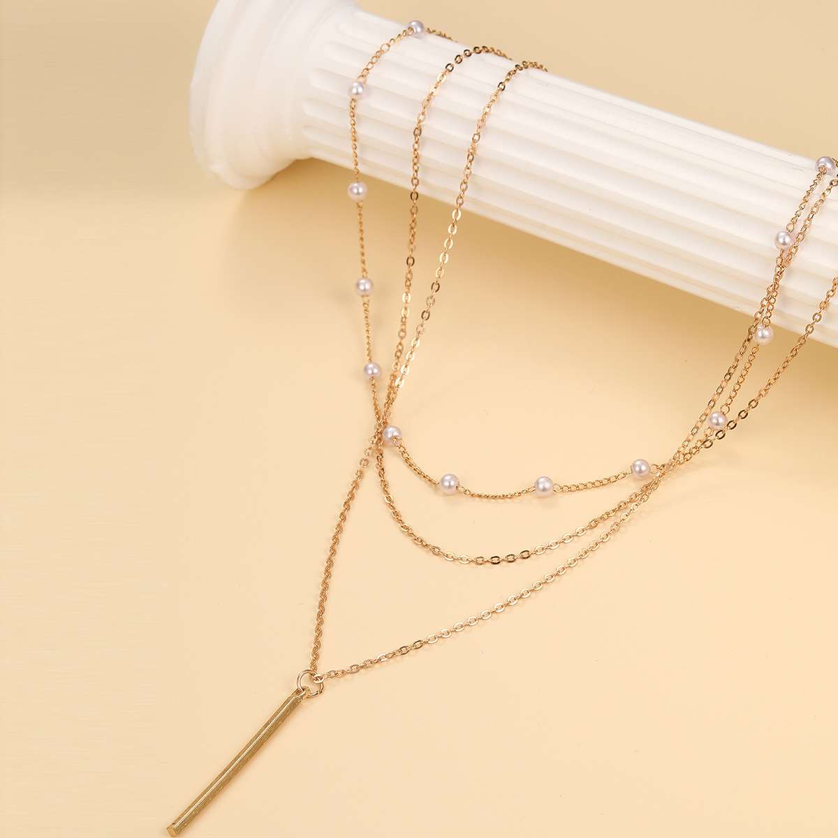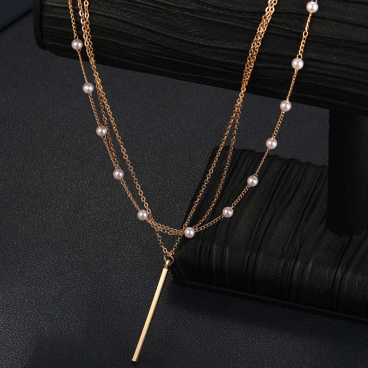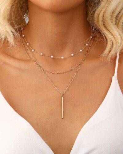 Linear Bar Stackable Necklace Wholesale. Crafted from high-quality alloy, this three-layer necklace features a vertical bar pendant, visually flattering the neckline. The design is minimalist.