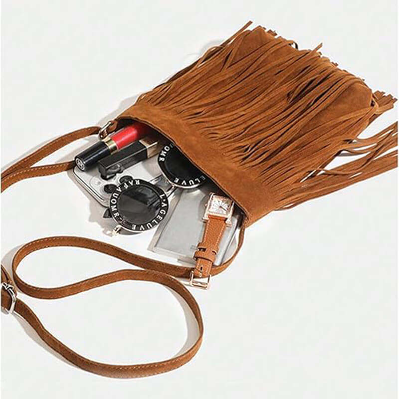 The soft, brownish color of the luxurious suede is adorned with tassels. Every sway and movement you make adds a dynamic and lively touch to this fringe shoulder bag.