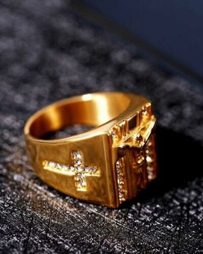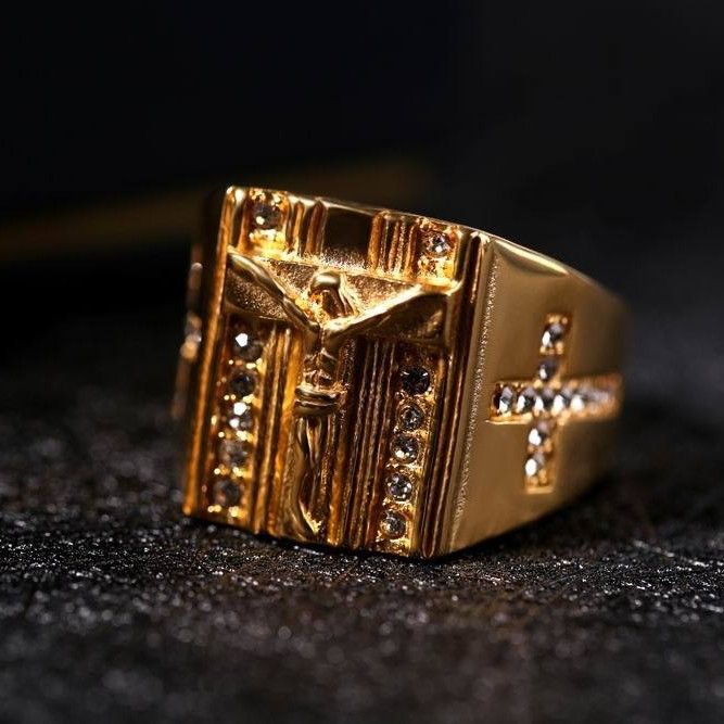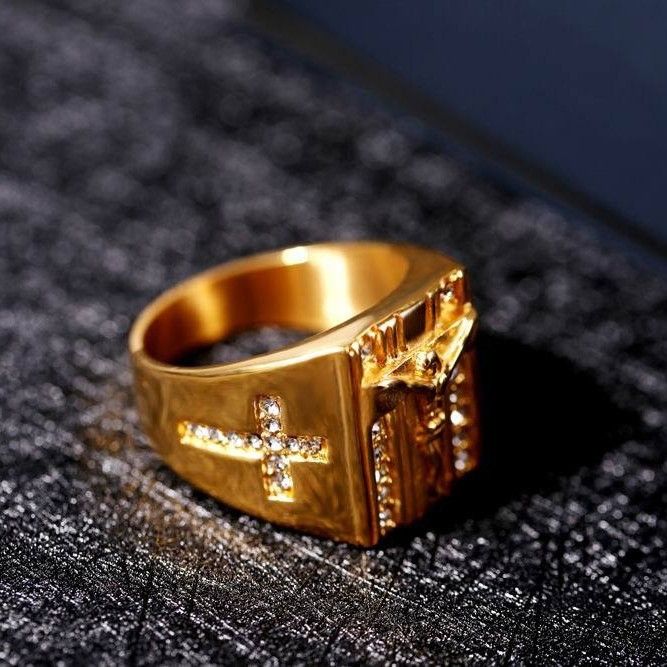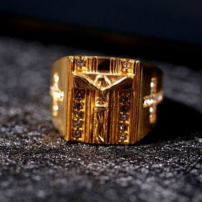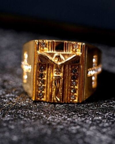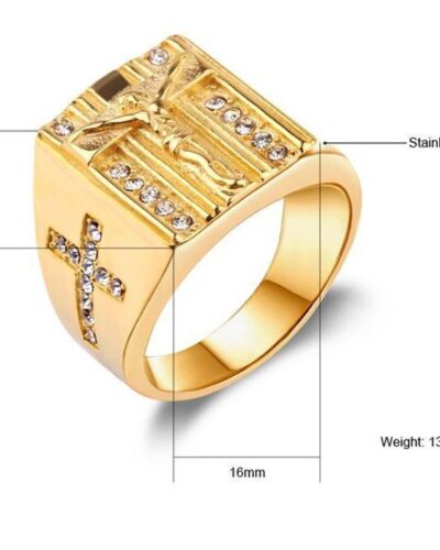 18K gold plated men’s Titanium band ring. The widened ring is specially designed for men, and it is comfortable to wear for a long time. A Jesus is carved on the front and it is plated with 18K gold, showing an elegant and generous personal taste.