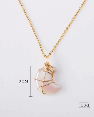 - Made of natural crystal stone, this pendant is designed in minimalist moon shape wrapped with copper wire.