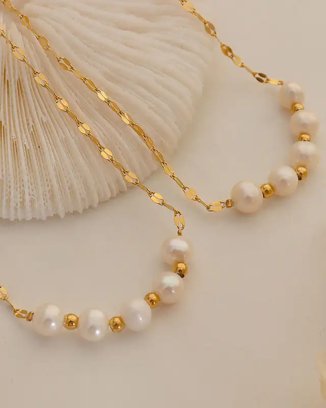 - This Vintage Pearl Necklace combines pearls with a gold lip chain for timeless elegance. Perfect for pairing with formal attire or evening gowns, its stainless steel construction ensures lasting color retention even with extended wear.