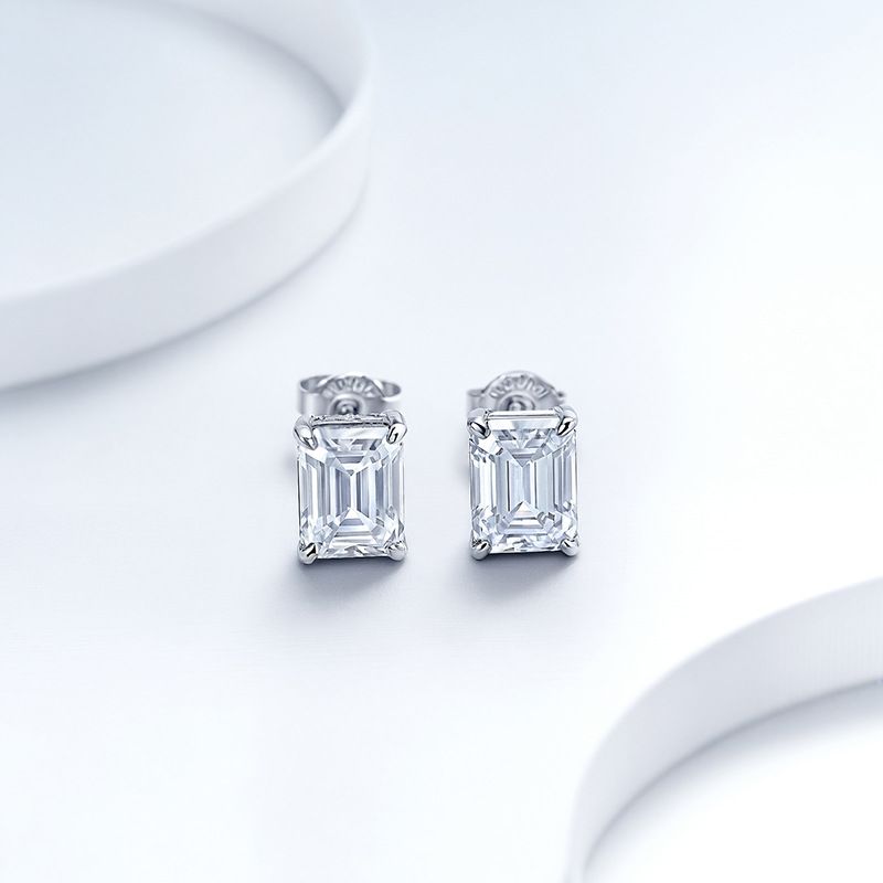 Emerald Cut Moissanite Earring Wholesale. Emerald cutting technology is used to show elegance and grace. Paired with a 925 sterling silver base and selected Moissanite, it reflects light without irritating the skin.