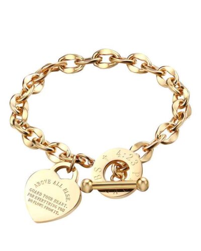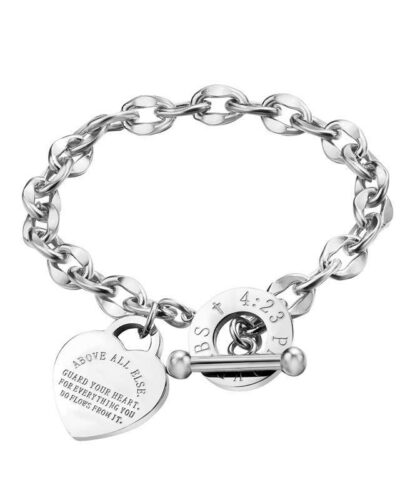 Biblical proverbs engraved on a premium stainless steel heart bracelet cleverly combine faith and fashion. Gain energy with every move. Waterproof and fade-resistant.