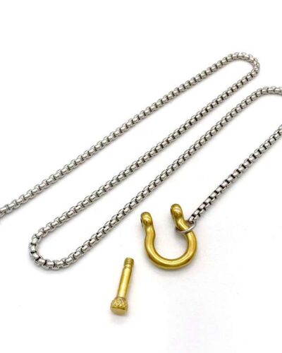 This carabiner necklace is crafted from high-quality stainless steel and is available with either a pearl or a Chopin chain. It features a horseshoe-shaped carabiner pendant, breaking the mold! Its unisex style makes it suitable for both men and women.
