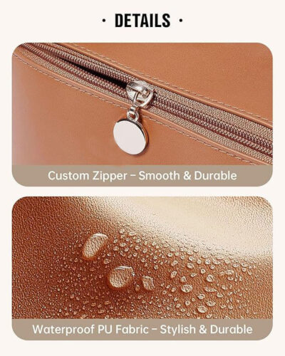 Crafted from smooth waterproof PU leather that’s easy to wipe clean, paired with a durable polyester lining. The makeup brush compartment features clear waterproof TPU, keeping brushes tidy and visible.