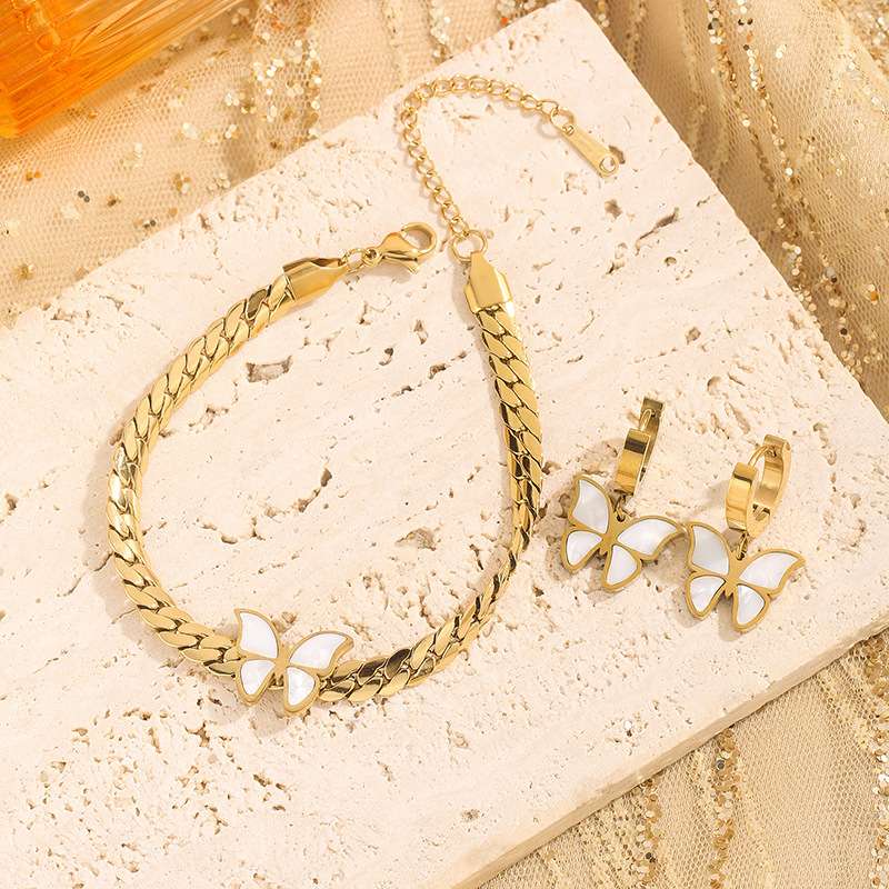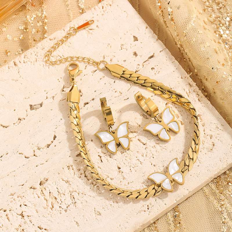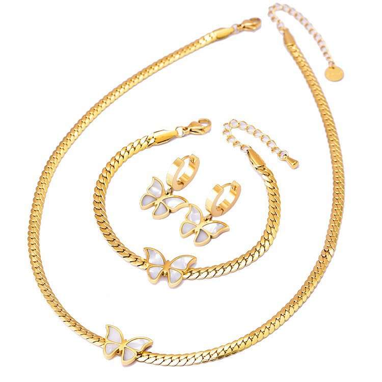 This butterfly-shaped pendant is crafted from high-quality shells and paired with a stainless steel blade chain to create this stainless steel butterfly necklace, bracelet, and earring set. The exterior is gold-plated to ensure long-term wear without fading..