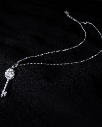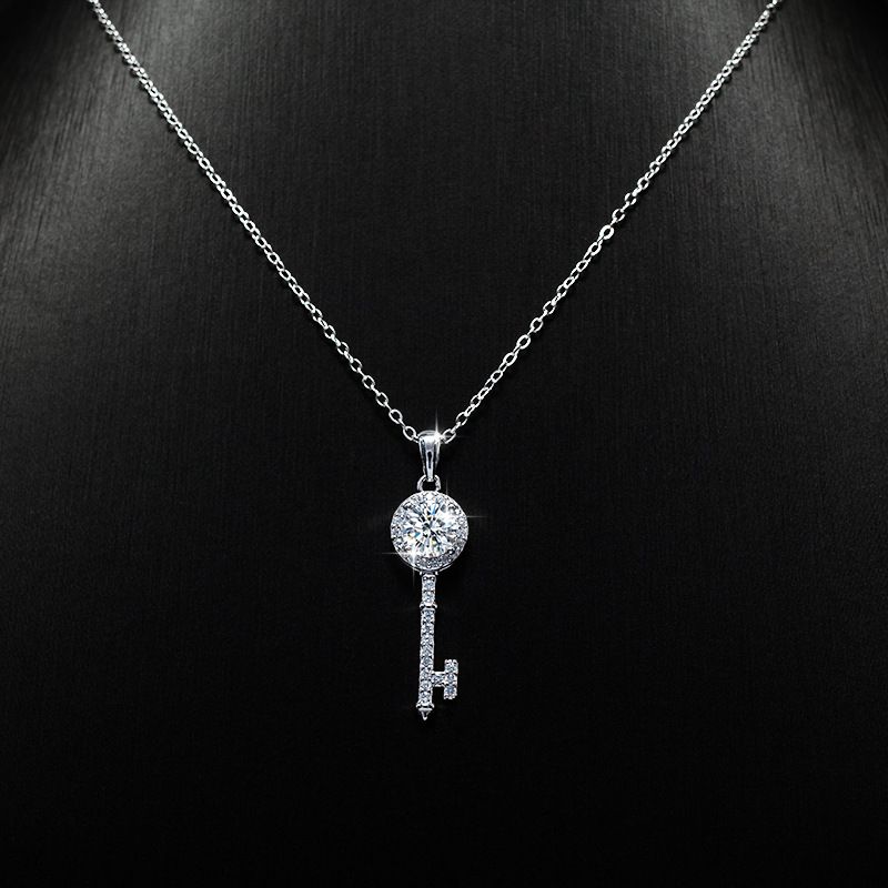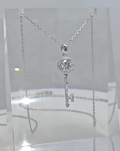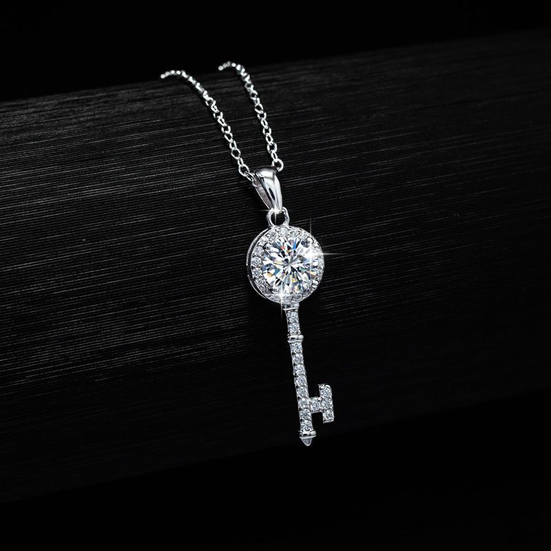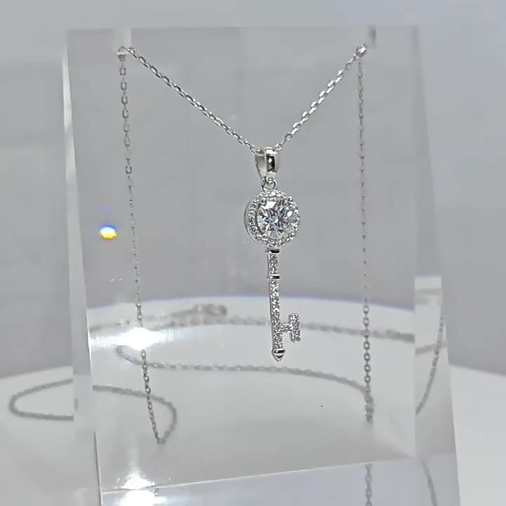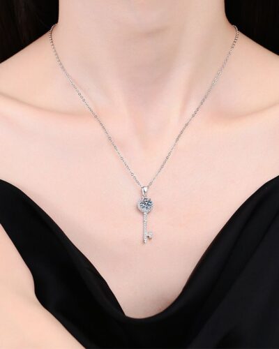Naszyjnik Key Moissanite z zawieszką ze srebra próby 925. Wykorzystuje srebrny łańcuszek próby 925 z ozdobą w kształcie klucza, a zawieszka jest inkrustowana wieloma kamieniami Moissanite. Unikalny design sugeruje otwarcie drzwi do przyszłego szczęścia i jest najlepszym wyborem na prezent!