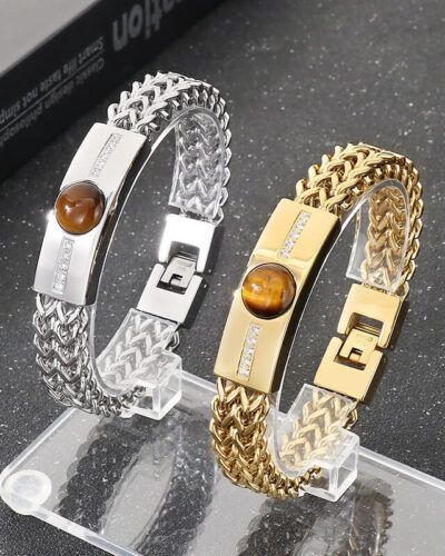 - Finedesignn: This double-layer stainless steel franco bracelet has a simple centerpiece and real tiger eye stone.