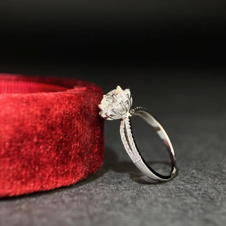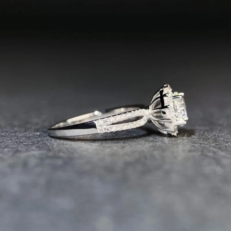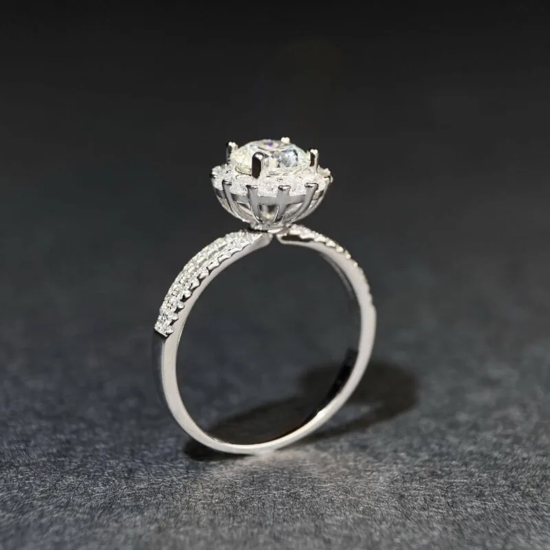 This round halo moissanite engagement ring features a round cut center moissanite stone. The selected round Moissanite main stone is matched with multiple small diamonds around the design, which makes it look bigger and more dazzling✨.
