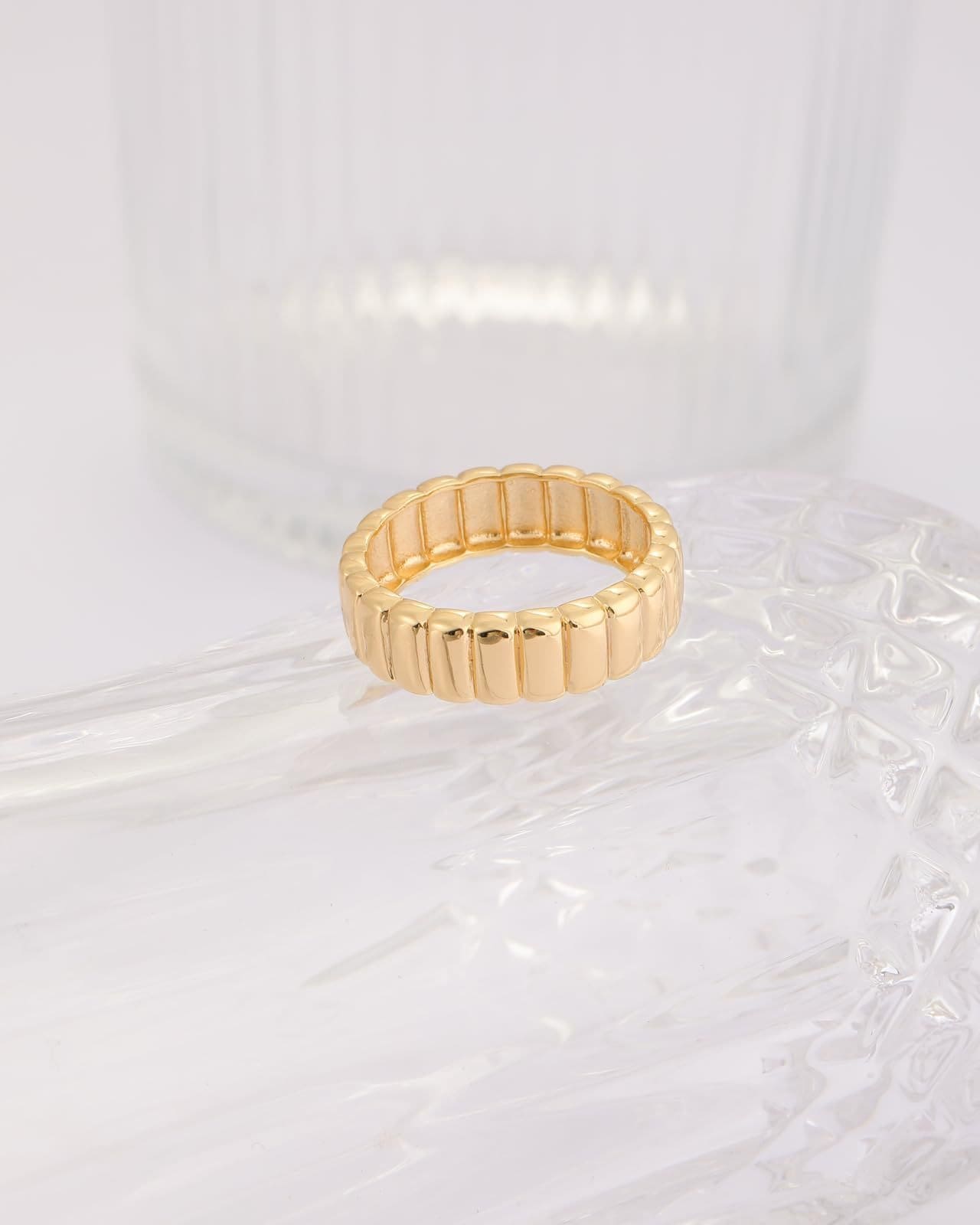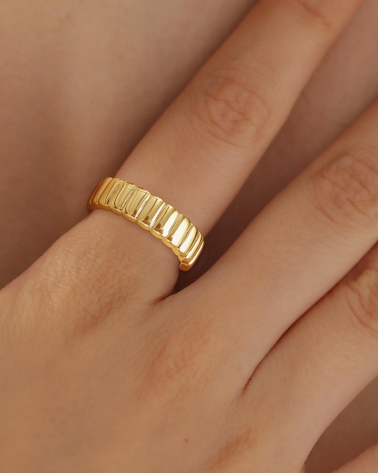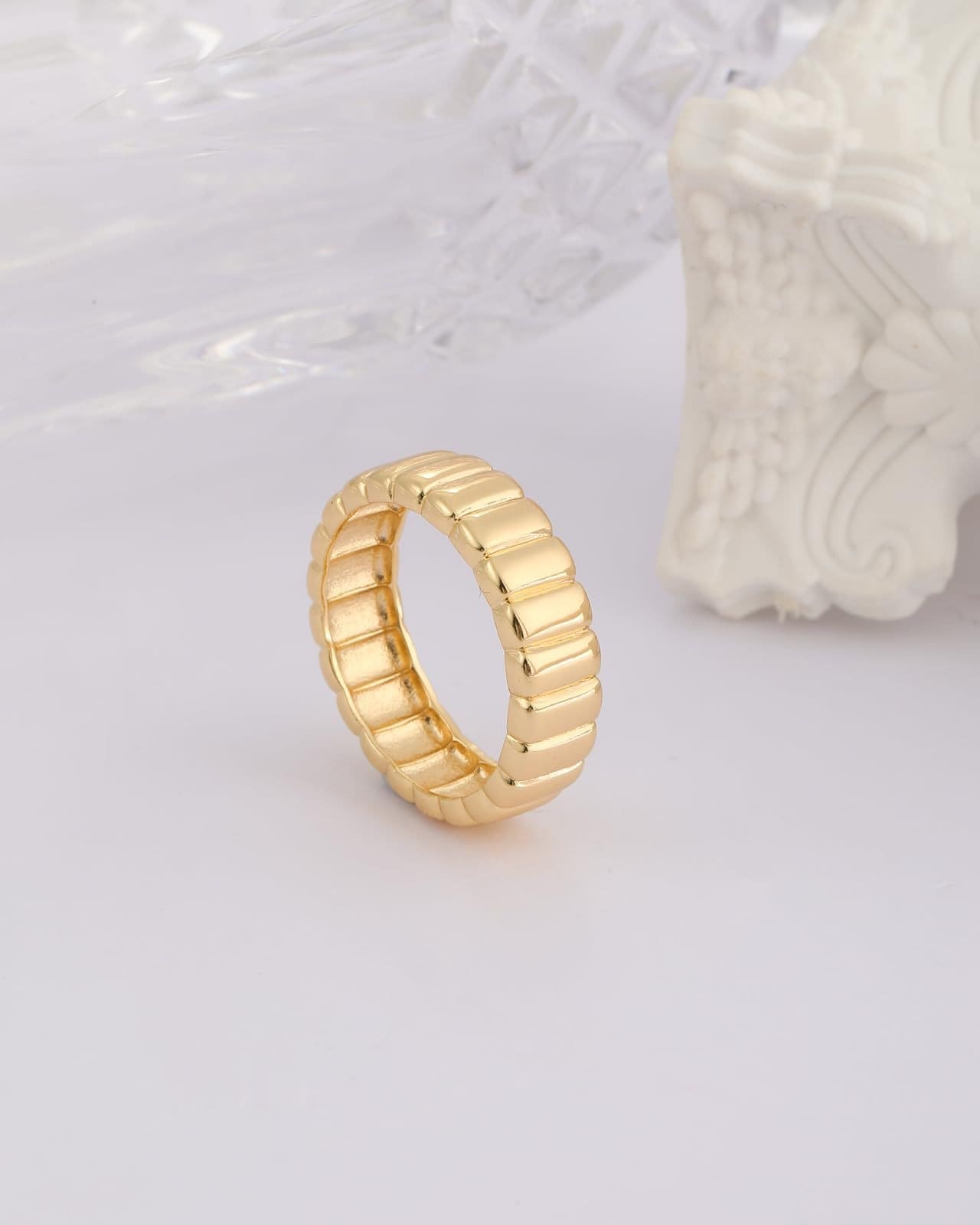 The combination of minimalist thick threaded design and the classic gold material makes this gold plated ring band delicate and versatile.