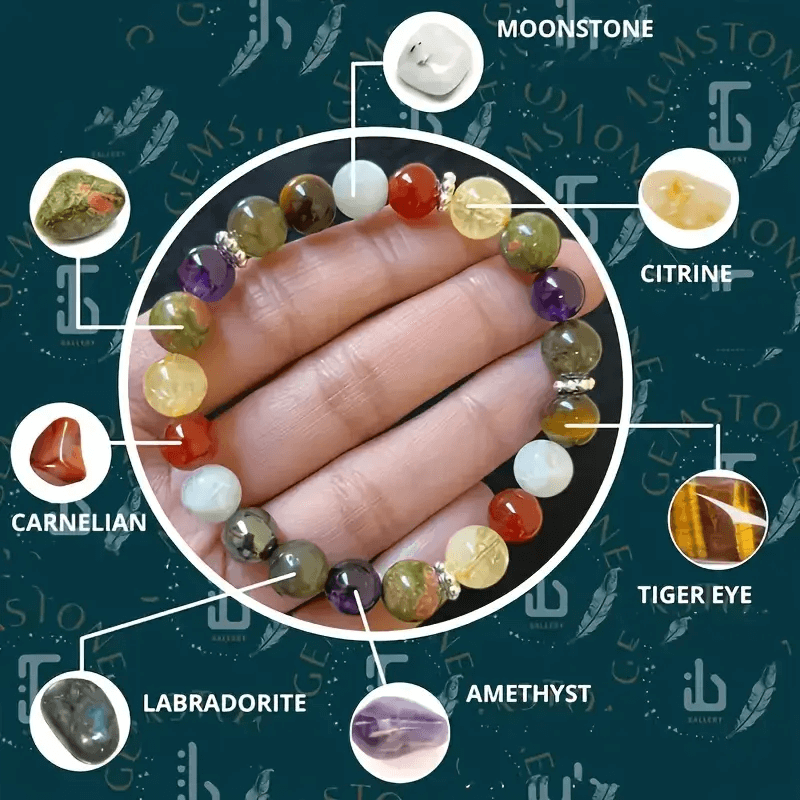 - 7 chakra stones include amethyst, labradorite, carnelian, unakite, moonstone, citrine, and tiger eye.