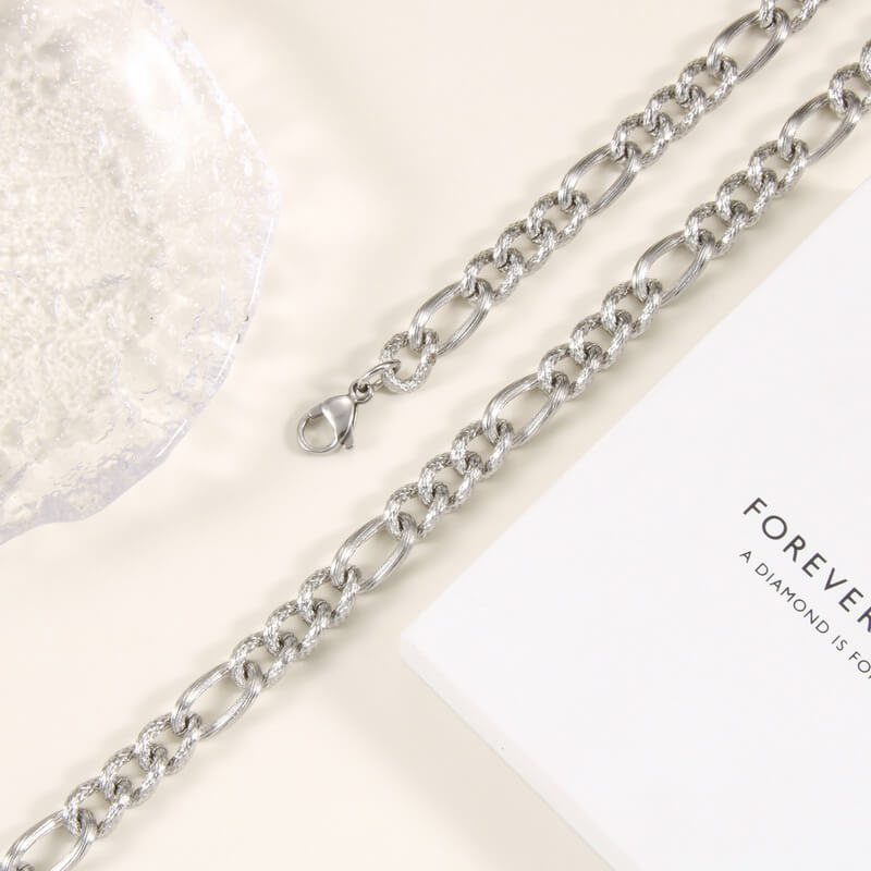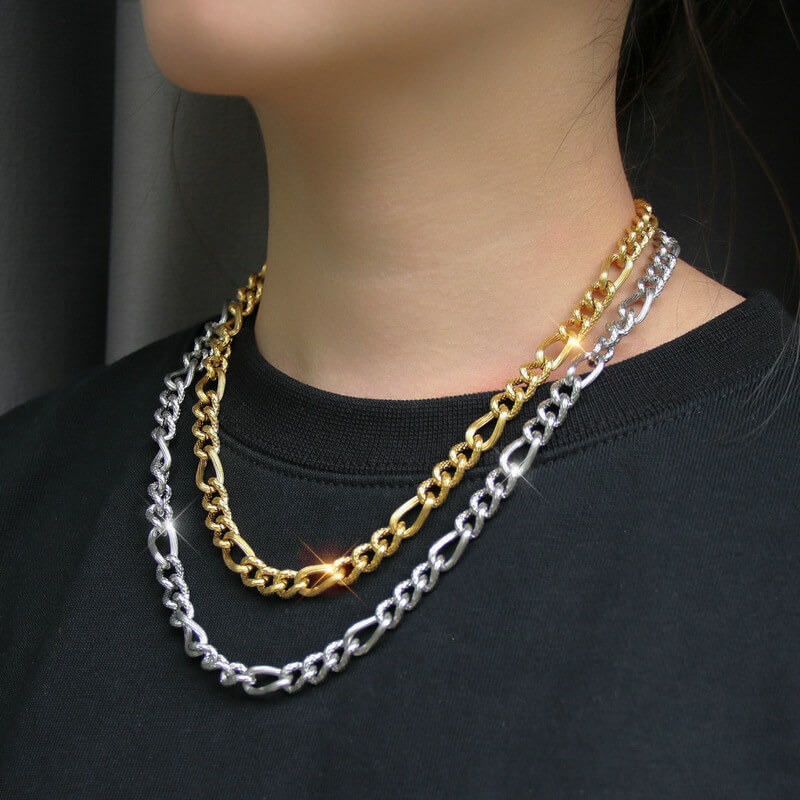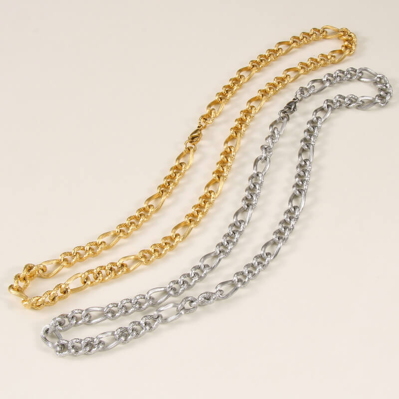 - Classic men’s stainless steel Figaro chains are plated 18K gold.