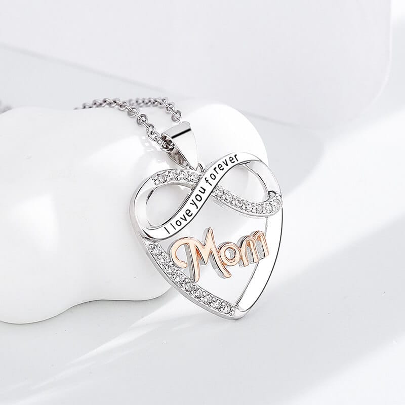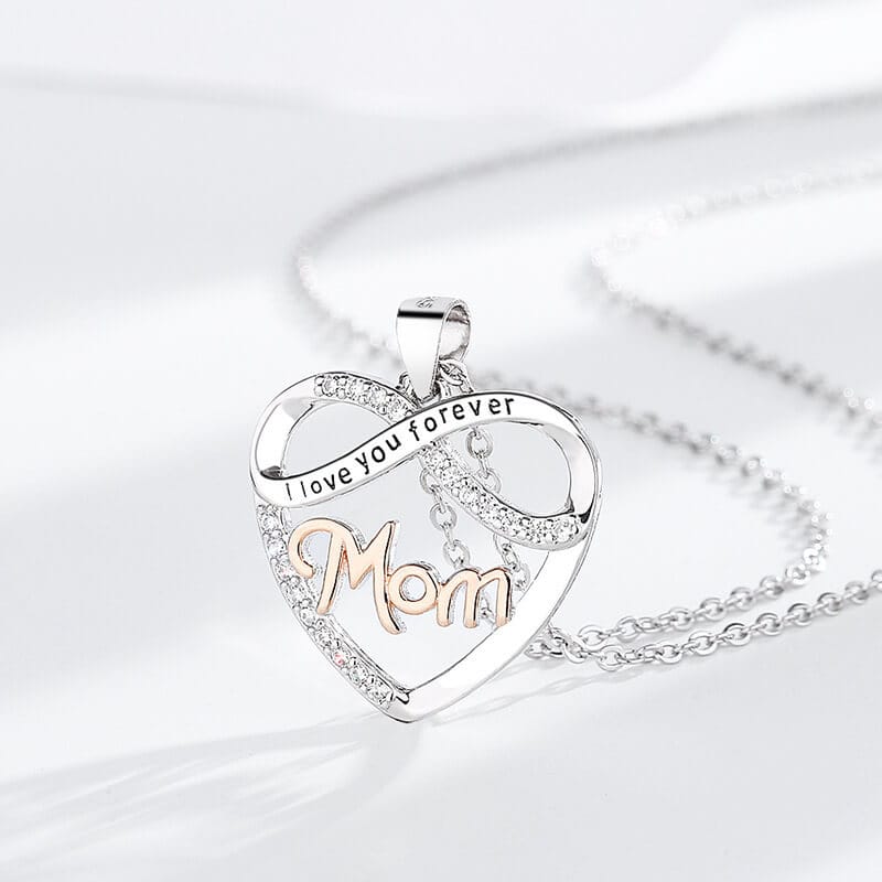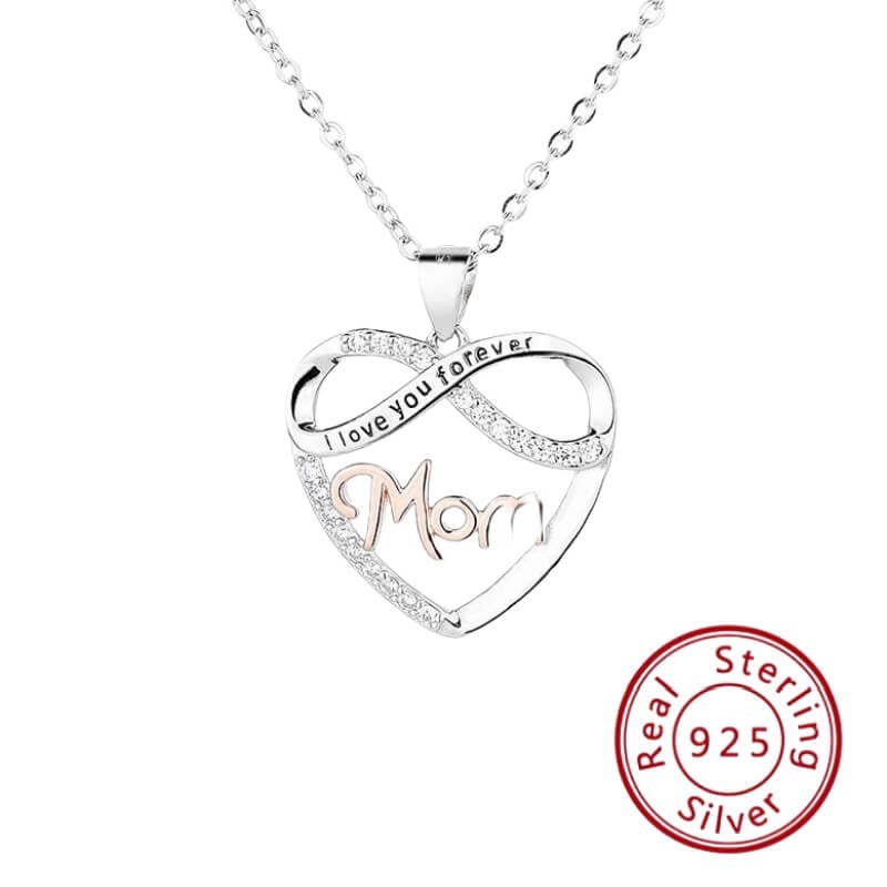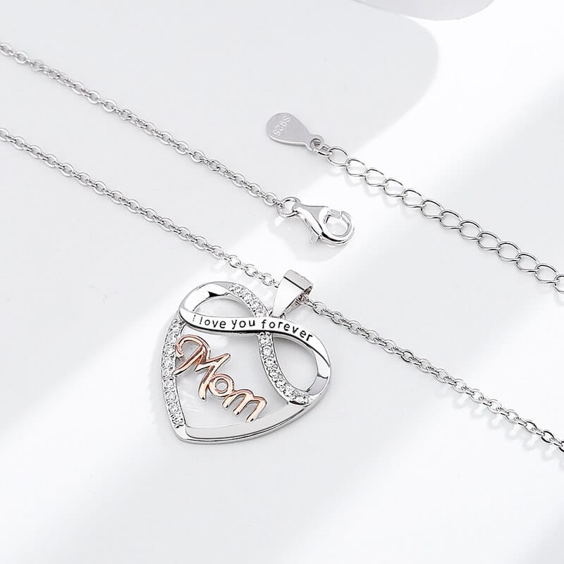 This bless mom sterling silver necklace features a heart pendant with mom and i love you forever as the main design.