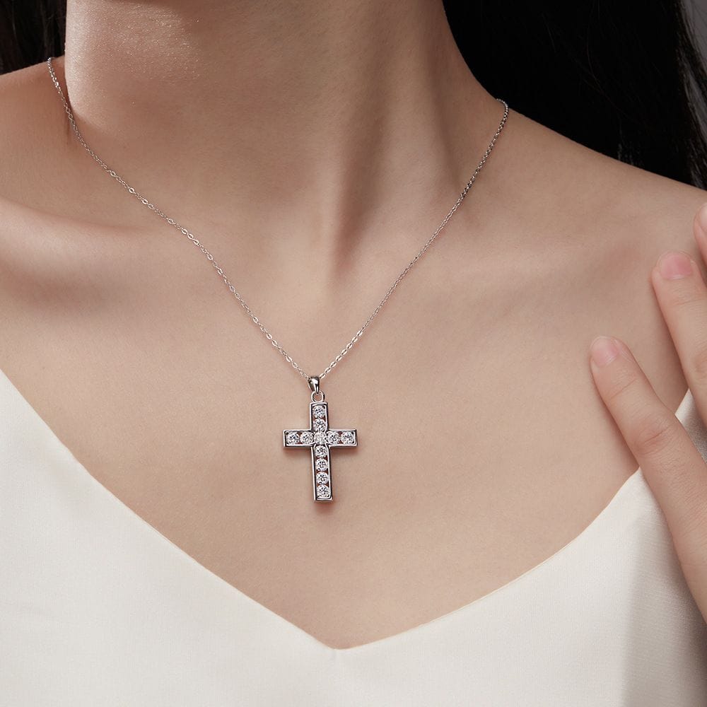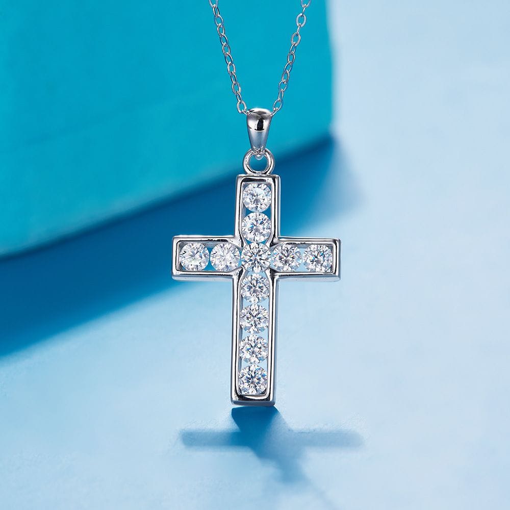 Cross Pendant Moissanite Necklace. 11 Moissanite stones are set in a 925 sterling silver base. The innovative hollow design increases the refractive surface and shines with sparkling fire. The simple cross shape symbolizes protection and faith!