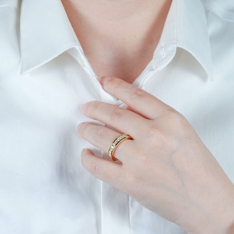 Wholesale simple 925 sterling silver Moissanite plain ring wedding ring✨! The ring is densely inlaid with bright, small diamonds and Moissanite, shining 360 °. It features the classic main stone design, which won’t snag clothes and won’t cause discomfort when worn for extended periods.