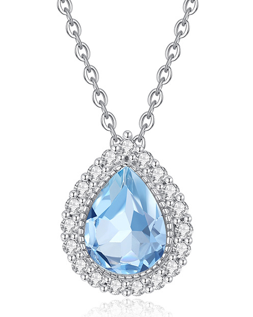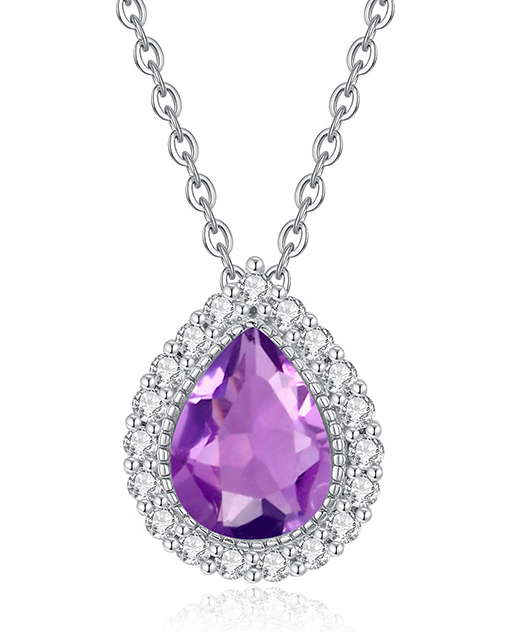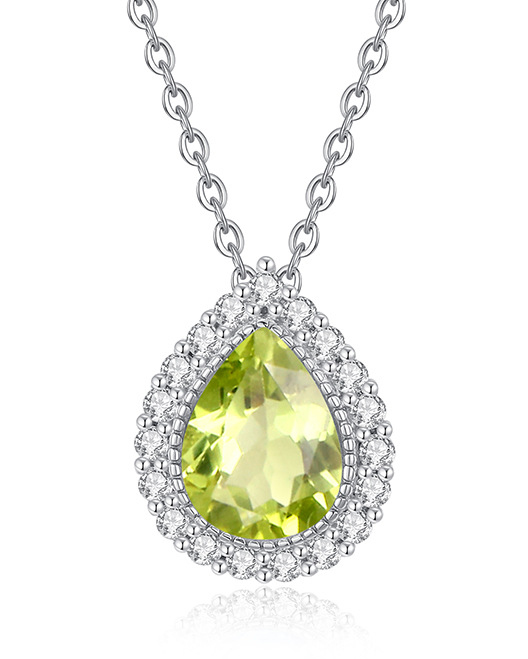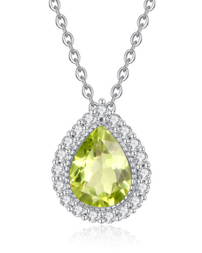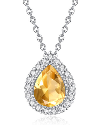 This pear birthstone necklace centers on an elegant waterdrop-shaped colored gemstone—its full-cut surface refracts a warm yet vivid luster when catching light. A circle of tiny sparkling stones wraps around the main gem, creating a delicate halo effect that boosts the overall shimmer.