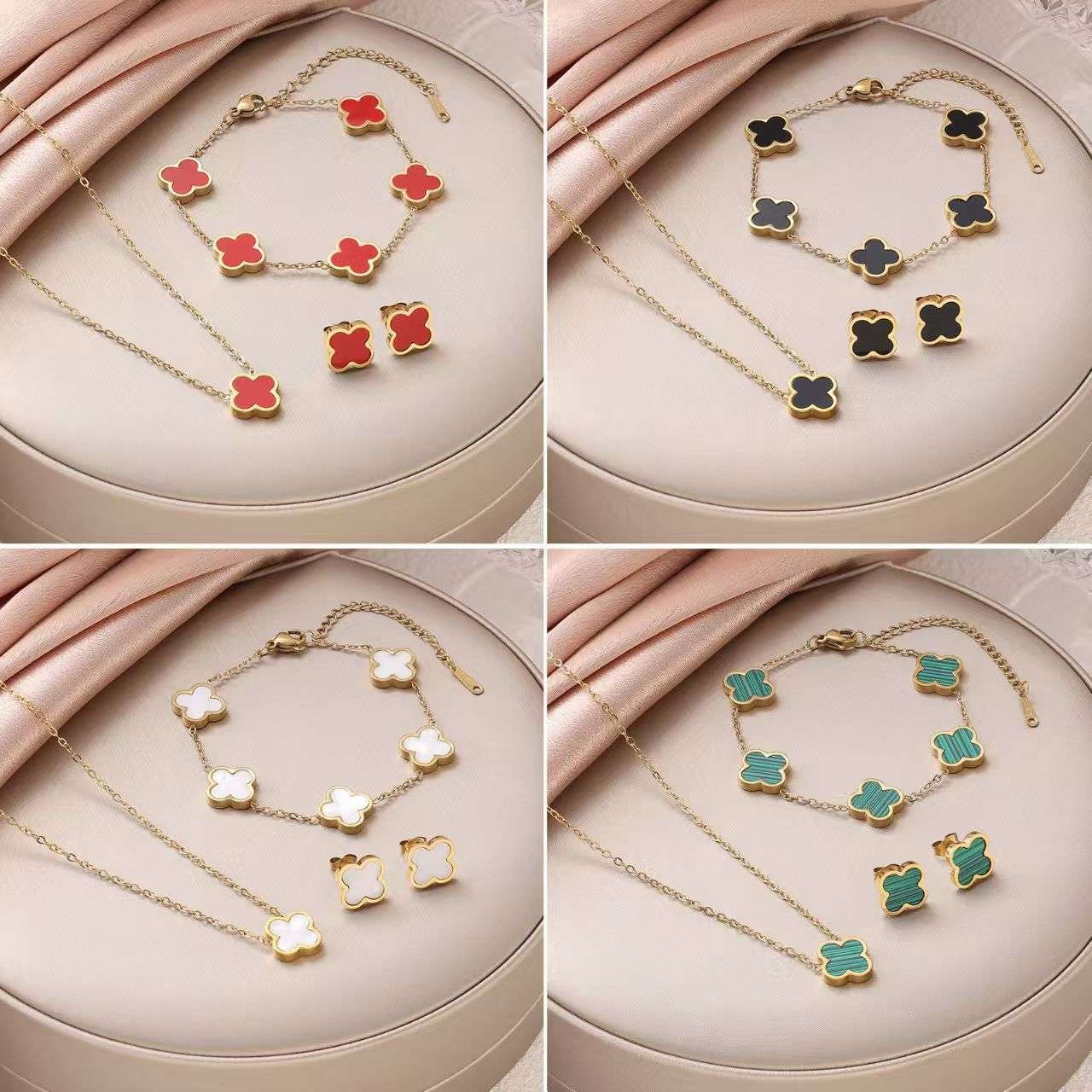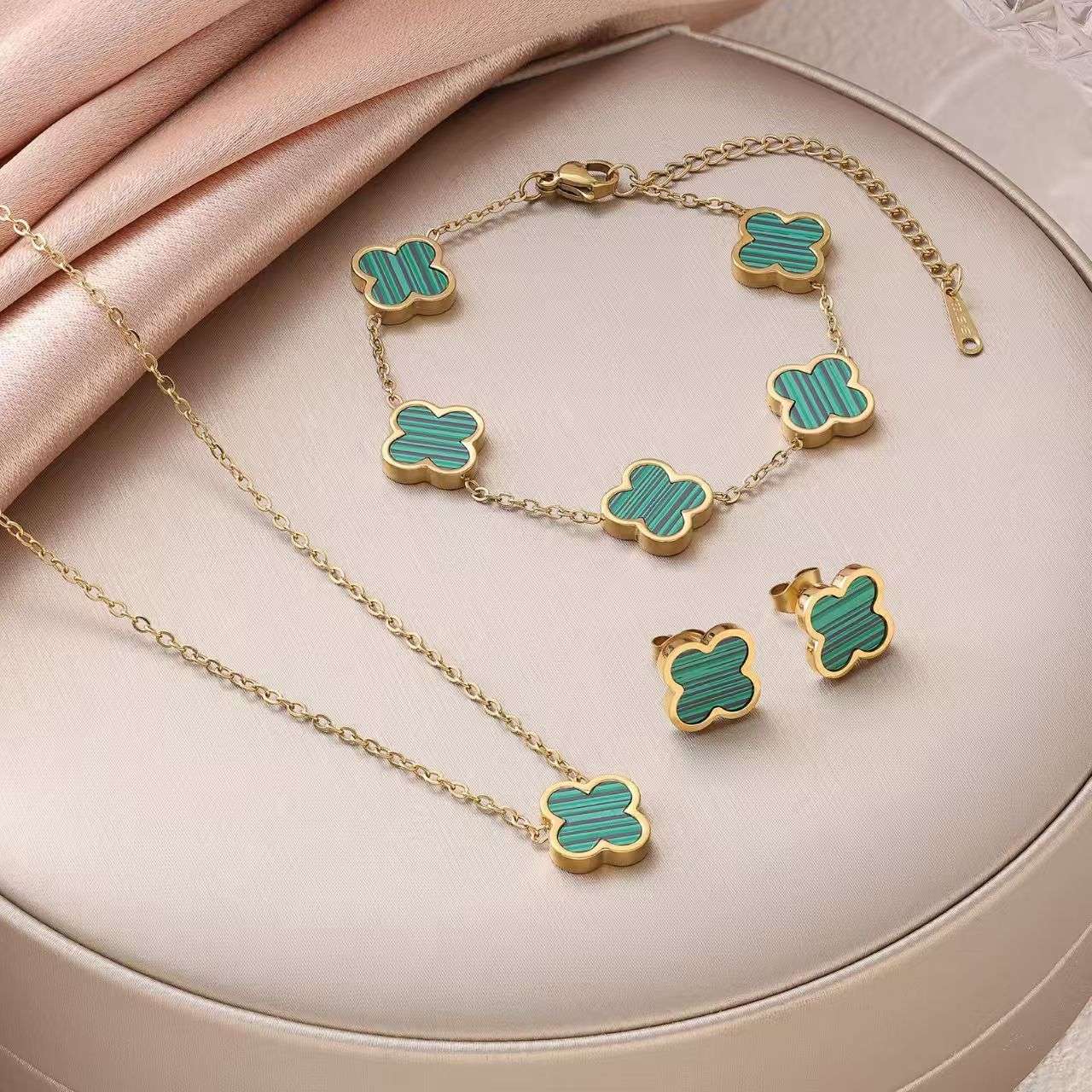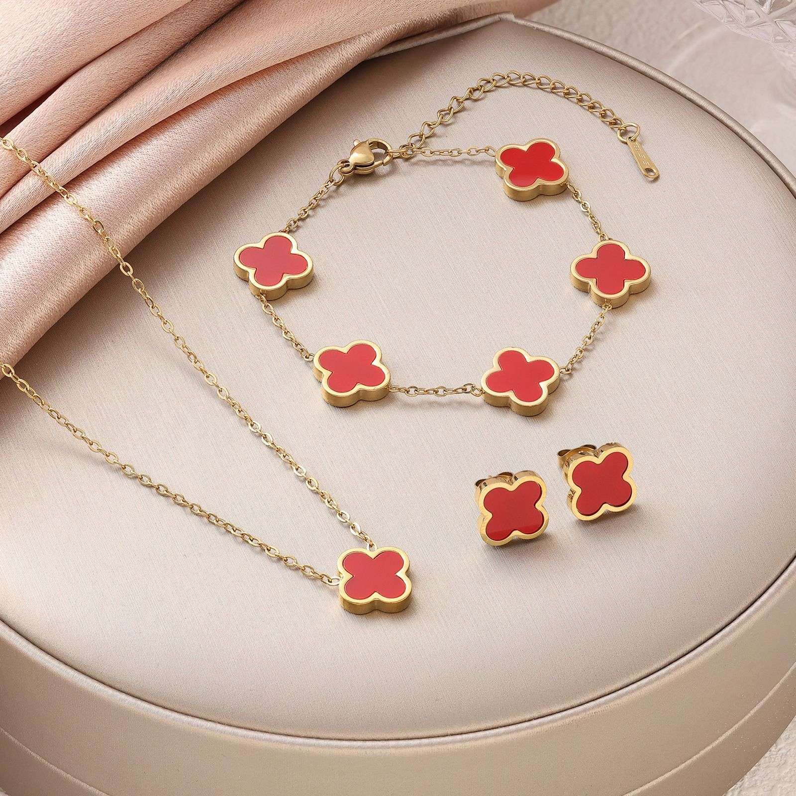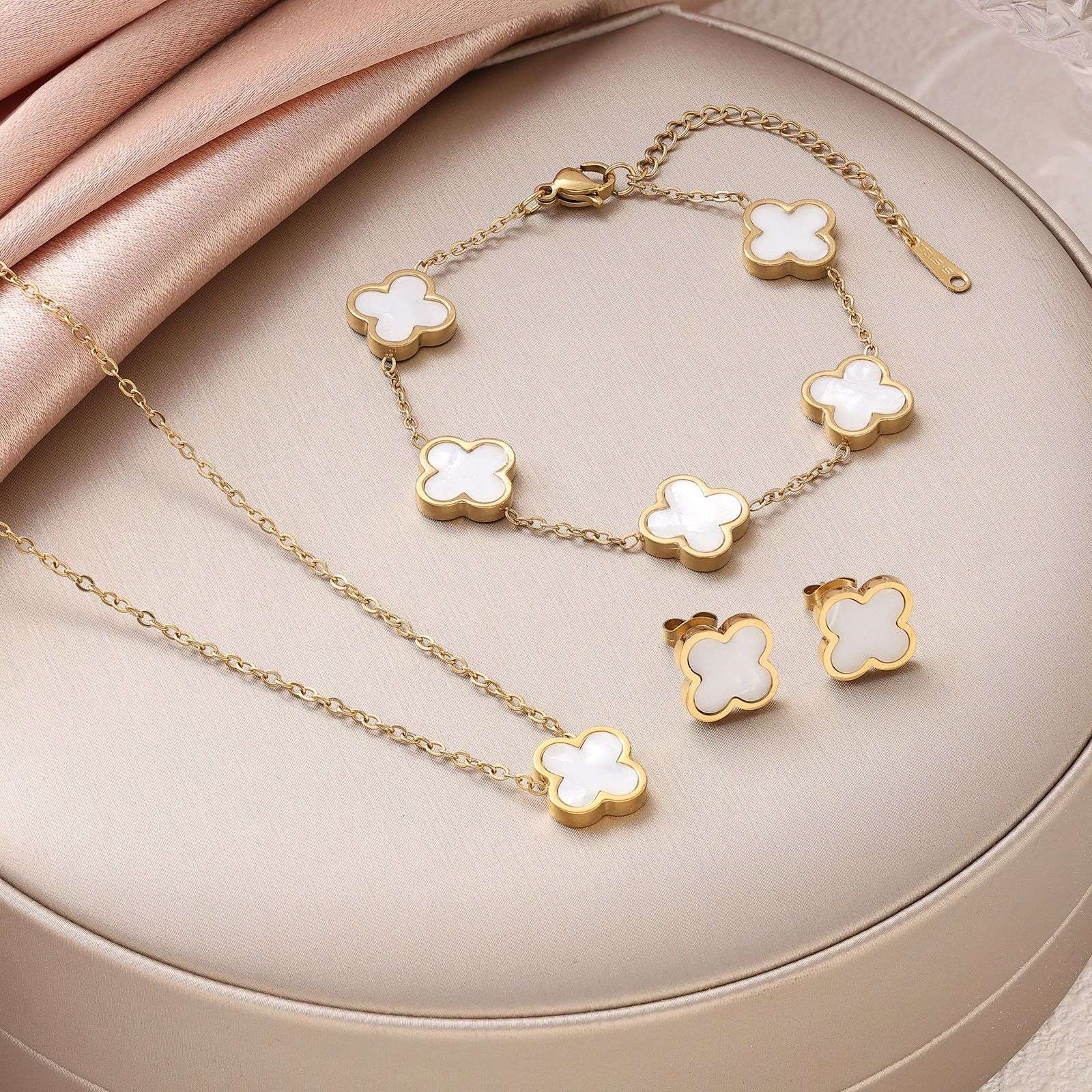 Shiny Stainless Steel Four Leaf Clover Bracelet and Necklace Set