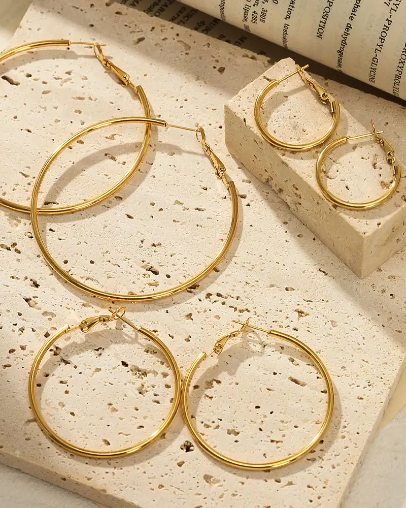 - These Stainless Steel Large Hoop Earrings feature a minimalist design with versatile styling, available in multiple sizes. The outer layer is plated with 18K gold, ensuring it won’t fade even with prolonged wear and is gentle on the skin.