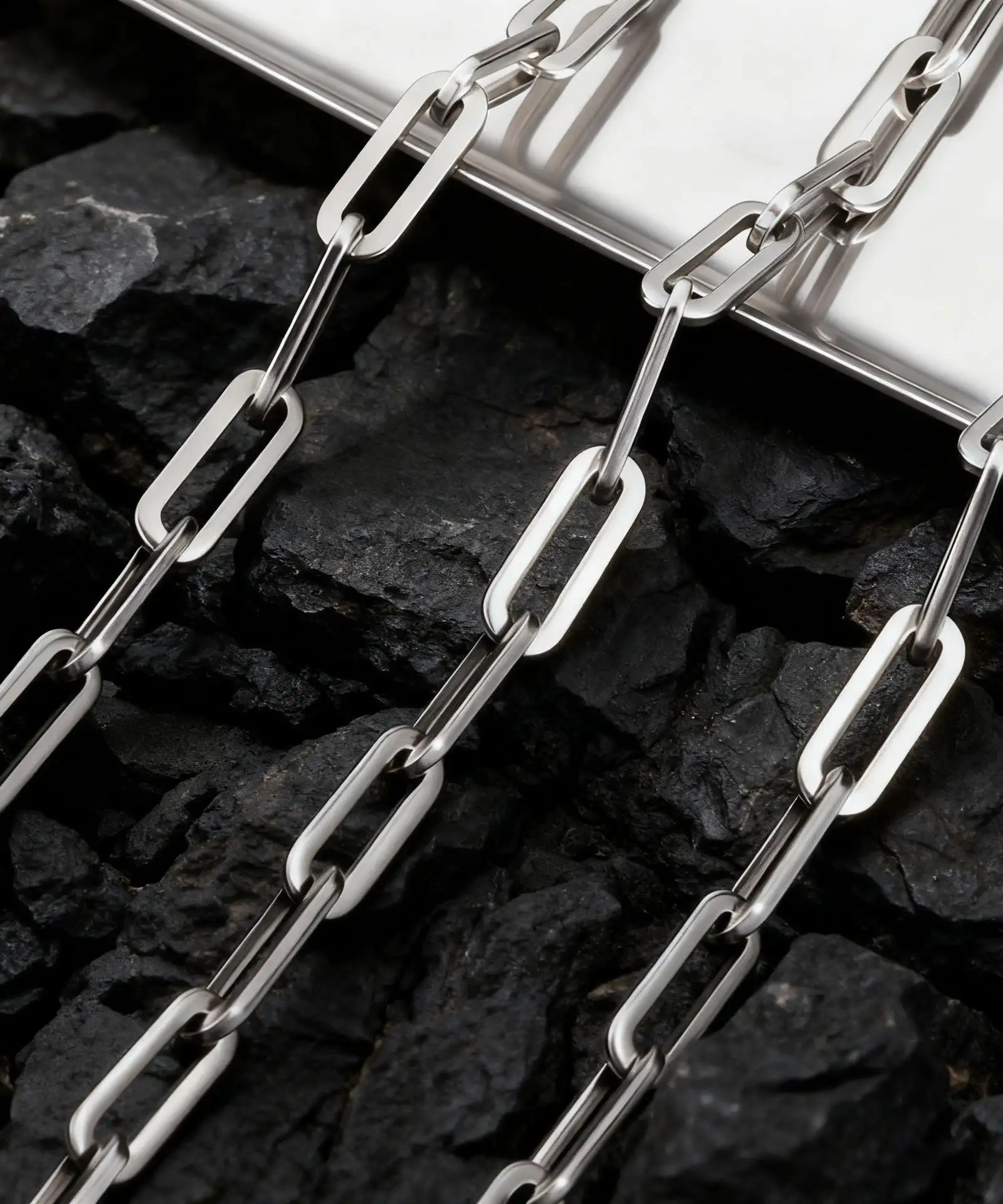 This paperclip link chain is crafted from premium stainless steel, featuring a minimalist design with bold character. It makes a distinctive statement whether worn alone or layered.