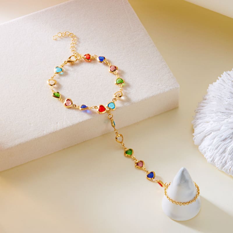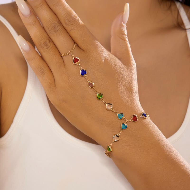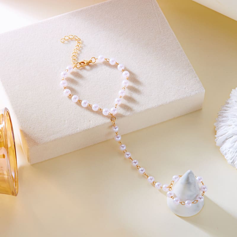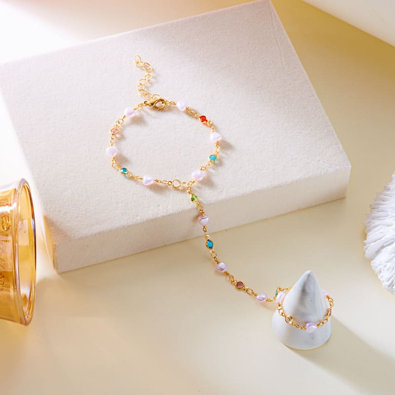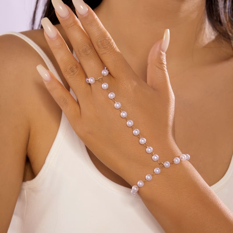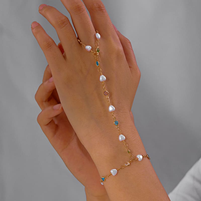 Vintage Heart Diamond Pearl Finger Ring Bracelet Gold