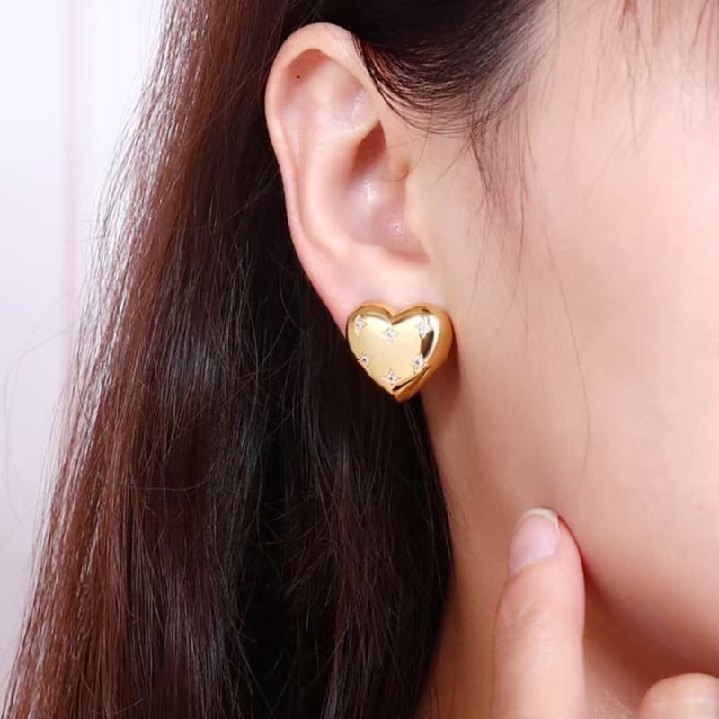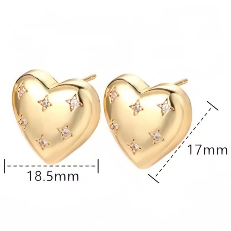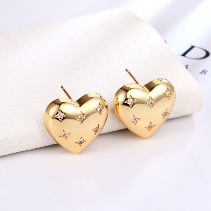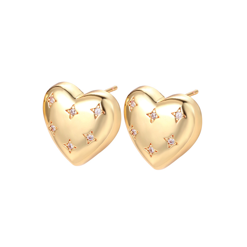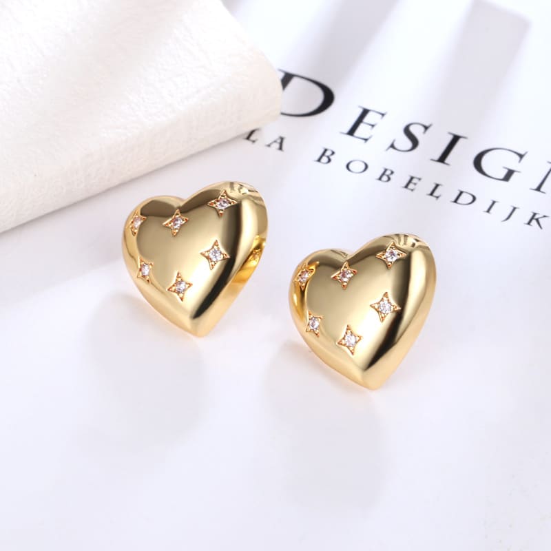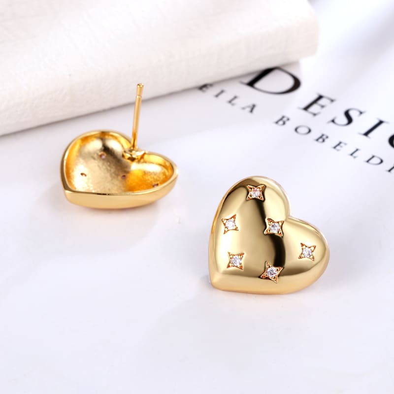 - Vintage Polished Gold Heart Earrings Studs with Inlaid Zircon