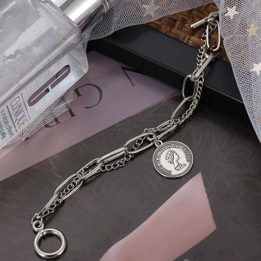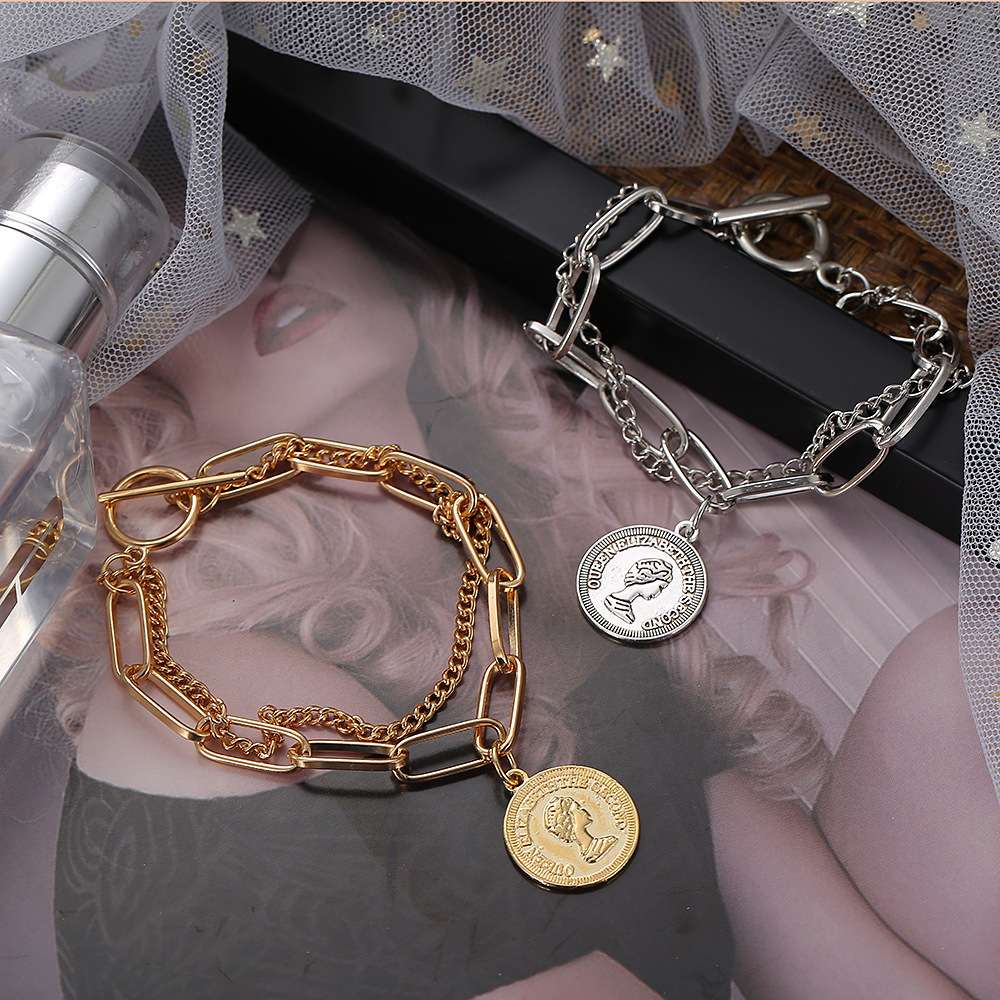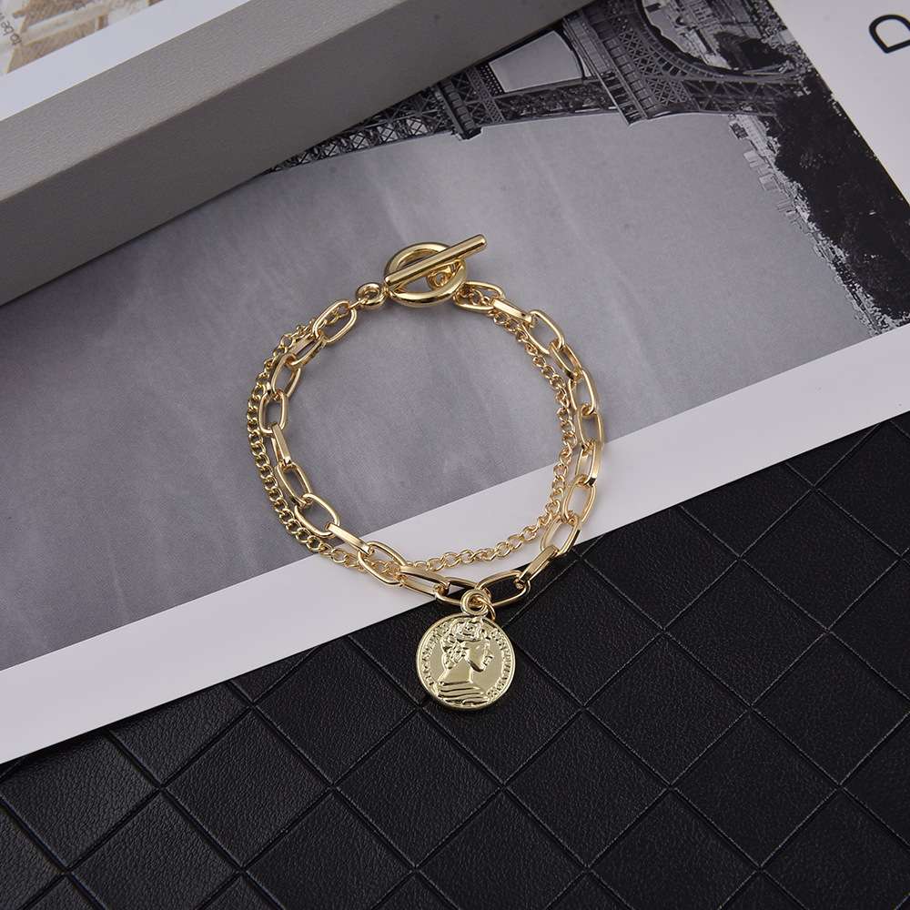 Alloy Bracelet with Vintage Portrait Pendant. Crafted from premium alloy, this bracelet features a vintage pendant with a delicate silhouette depicted in classical relief. Available in dark gold or silver-grey, it offers a discreet yet stylish design.