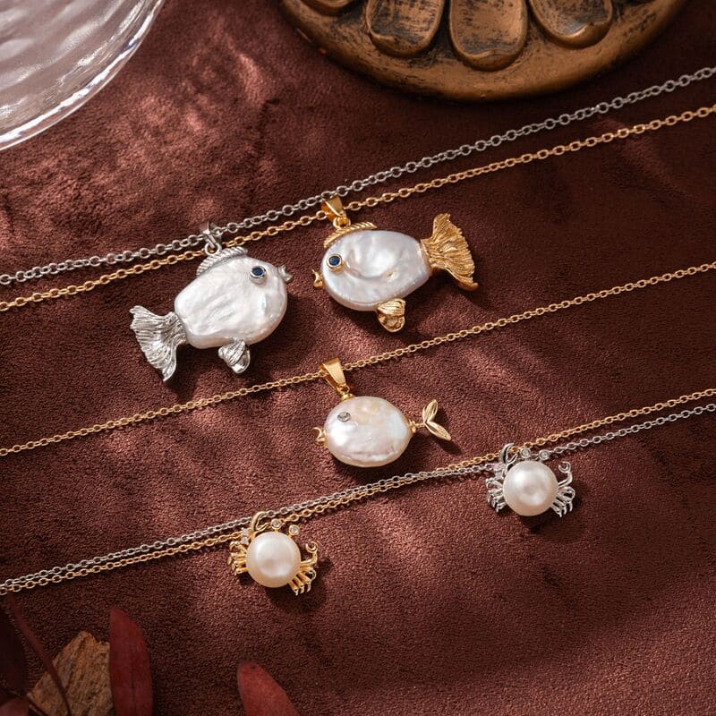 Colar de pérolas de água doce com pingente de caranguejo e peixe