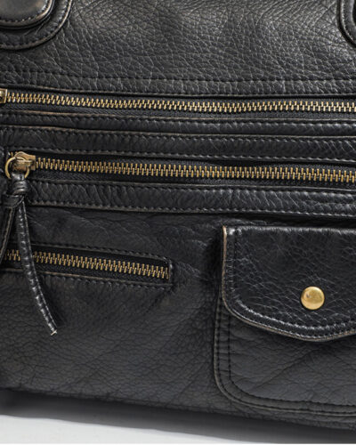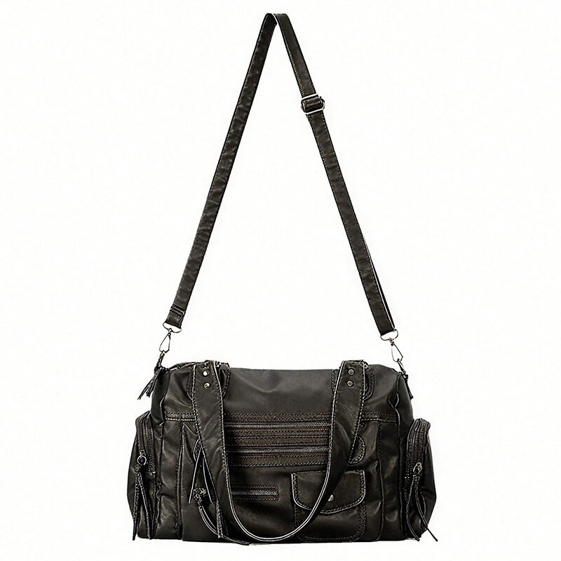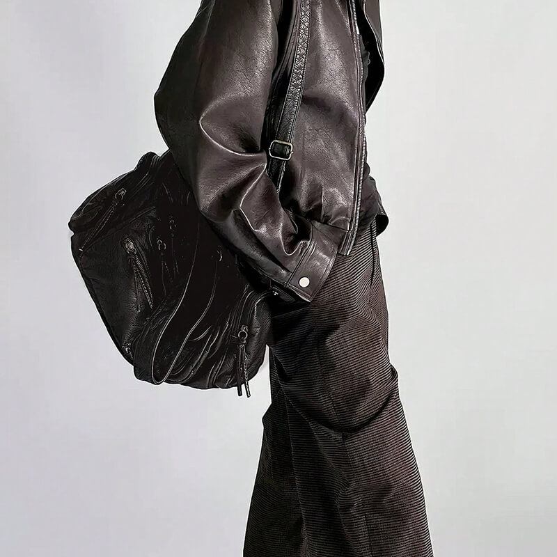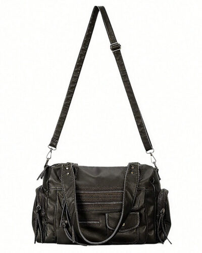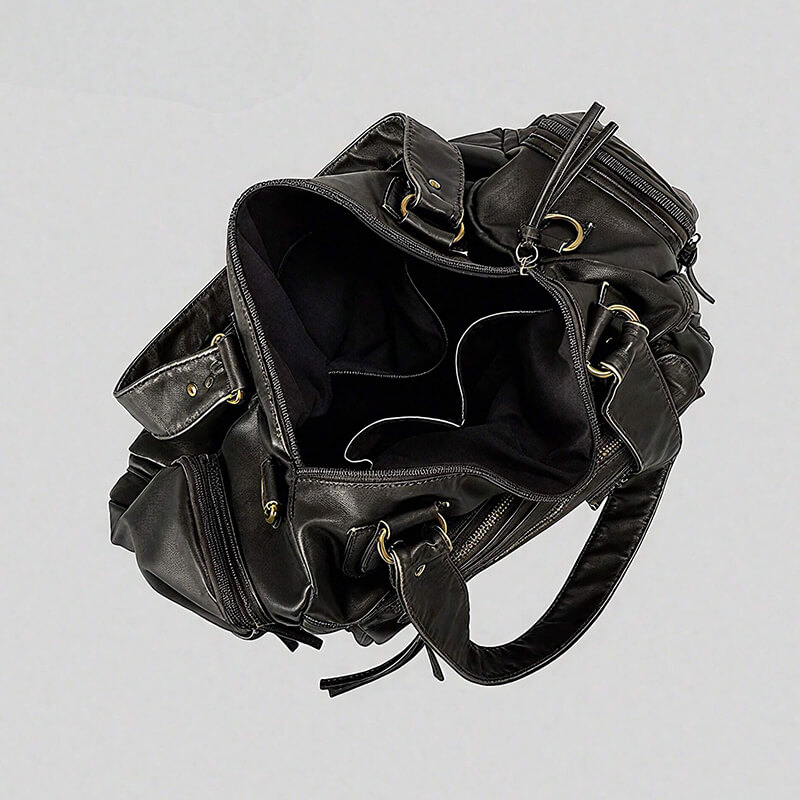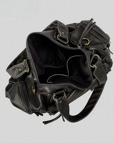 Made from buttery-soft, distressed leather in a deep matte black, the handbag boasts an edgy hobo shape with rugged hardware, multiple zip pockets —perfect for those who love a touch of rebellion in their accessories.